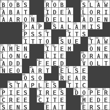 ACROSS 1. Moves up and down 5. Director Reiner 8. Cole _ (cabbage dish) 12. Blind as ____ 13. The content of cognition 15. Australian parrot (variant) 16. Composer Copland 18. Small valley 19. An important port of Yemen 20. Infant food 22. Deli grouping 24. Inconspicuous attention getter 26. It is 27. "Tell ____ the Marines!" 28. Take to court 29. The 23rd letter of the Hebrew alphabet 32. So be it 35. A distinct part 37. Single 38. Yearn 39. Whopper 40. Northwest Algerian city 41. Find the sum of 42. Nourish 43. Electrical Unit 44. Modern: prefix 45. Tate display 46. Otherwise 49. Bear (Spanish) 50. Stern 51. Paper fasteners 55. Nervous spasm 56. Sliced desserts 57. Angers 59. Drug addict 63. Algonquian 64. Quote 65. Ancient Persian 66. Elected reps. 67. Ingest 68. Celtic language DOWN 1. Sound made by sheep 2. Chief or king in Benin or Nigeria 3. Tavern 4. Closing up, plugging up 5. To free from 6. Lyric poems 7. Actor Lugosi 8. Shuts with force 9. Farming town in central California 10. Ancient Greek god of war 11. Acquire through effort 14. Plant genus of onion and garlic 17. Political cartoonist Thomas 21. Pacific Standard Time (abbr.) 23. Had dinner 25. Bathroom 28. Sowing specialist 29. "Corrida" creature 30. Of or related to the anus 31. Gone 32. ____ Jay Lerner 33. Method 34. Inside; within (prefix) 36. Make a knot 40. Conquer 42. Romp 45. Cleo's killer 47. Allow 48. Alleged 49. Fertile tracts in a desert 51. The founder of a family 52. Adolescent 53. 4th largest of the Great Lakes 54. Bristle 56. Personal Computers (abbr.) 58. Put into a specified state 60. For each 61. Begley and Asner 62. To riddle