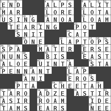 ACROSS 1. Conclude 4. High mountains 8. Came down and settled, as after flight 12. Spoil 13. Old wives' tales, e.g. 14. Globular water bottle used in Asia 15. Exploiting 18. Small Philippine buffalo 19. Rich soil 20. Rending 22. Plant holder 23. In a ____ (agitated or irritated) 24. Feline 25. Single 26. Portable computers 30. Health resort 33. Mother 36. Celtic language 37. Religious women 39. Altar cloth linen 40. Compass direction 41. _ vera 42. National forest in Provo, Utah 44. R.R. building 45. Pre-World Series prize 47. Pet locale 50. Black tropical American cuckoo 51. Greek god of love 53. Parent Teacher Association (abbr.) 54. Leopard's kin 57. Pacific island yam 59. Edge tool used to cut and shape wood 61. Being in motion 63. SW Saudi Arabia district 64. Wander 65. Binary compound 66. Scottish caps 67. Hearing organs 68. Born DOWN 1. Australian flightless bird 2. Political cartoonist Thomas 3. Frees from moisture 4. Actor Alda or Thicke 5. Having great length 6. Adept person 7. Ocean 8. One to whom something is allotted 9. Spoils 10. Call ___ day 11. Scottish cap 16. Billionth: prefix 17. Broad smile 21. A whole individual unit 22. Infant food 24. Automobile 26. For fear that 27. Mouths or openings 28. Inconspicuous attention getter 29. Stalk of a moss capsule 30. Fastener 31. Whine 32. At once, immediately (arch.) 34. "This won't hurt ____!" 35. Shallow baking pan 38. Elected representatives 42. Corn or form start 43. Toward shelter 46. Santa ___, CA 48. Type of rug 49. Plant holders 52. Smooth fabric 53. Demure 54. Russian ruler of old 55. Equivocates 56. Flintstone garb 57. Make lace 58. White ___ sheet 59. "We ___ not amused" (Victoria) 60. ___ good deed 62. To separate or throw off