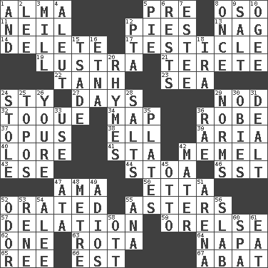 ACROSS 1. _ mater 5. Before (prefix) 8. Bear (Spanish) 11. Famous astronaut Armstrong 12. Sliced desserts 13. Tired old horse 14. Erase 17. A testis 19. A period of five years 21. Cylindrical with tapered ends 22. Hyperbolic tangent 23. Ocean 24. Filthy place 27. 24-hour periods 29. Lower and raise head in agreement 32. Woman's close-fitting hat 34. Atlas unit 36. Loose flowing garment 37. Musical composition 38. Pipe bend 39. Roberta Peters solo 40. Old wives' tales, e.g. 41. R.R. building 42. Klaipeda city 43. Compass dir. 44. Portico 46. Fast jet (abbr.) 47. Nanny (var.) 50. Singer James 52. Spoke pompously 55. Michaelmas daisies 57. Accusation by an informer 59. Threatening words 62. Single 63. Roll call or roster of names 64. California wine valley 65. To separate or throw off 66. Eastern Standard Time (abbr.) 67. Blind as ____ DOWN 1. Plus 2. Area sheltered from the wind 3. Place where flour is made 4. Native American of Southwest Alaska 5. Sliced dessert 6. Musical pauses 7. First name in cosmetics 8. At one time in the past 9. Table seasoning 10. Double curve, resembling the letter S 12. Parent Teacher Assoc. 15. Sadhe (variant) 16. Inactive volcano in Sicily 18. Retirement account (abbr.) 20. Poems 24. Took without asking 25. Traditional theme or motif 26. You are 28. Table seasonings 29. Typical standards 30. Off-Broadway awards 31. Started a card game 33. Purpose 35. Food holders 36. Actress Charlotte 42. Mother 45. "Beetle Bailey" pooch 47. "One Day ___ Time" 48. Distance measurement (Brit.) 49. Goodbye (Sp.) 51. Sports stadium 52. Scent 53. French philosopher Descartes 54. Toward shelter 55. Santa ___, CA 56. Thick slice 58. Baseball player Mel 60. Health resort 61. Erode