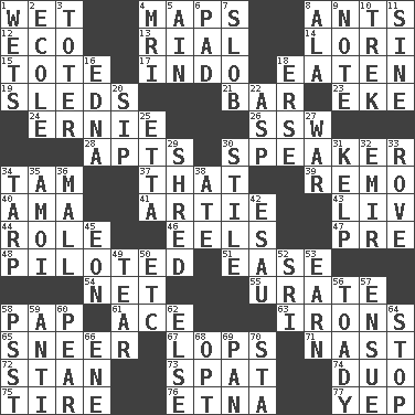 ACROSS 1. Dripping 4. Atlas contents 8. Pismires 12. Environmental prefix 13. Monetary unit of Yemen 14. Australian parrot (variant) 15. Haul 17. _ china 18. Eroded 19. Bobsleighs 21. Tavern 23. Make supply last 24. Bert's buddy 26. Compass dir. 28. Flats, for short 30. Orator 34. Scottish cap 37. Not this but _ 39. San ____ (Riviera town) 40. Nanny (var.) 41. Nick name for Arthur 43. 54 in ancient Rome 44. Hero or heavy, e.g. 46. Snakelike fish 47. Before (prefix) 48. Manned the helm 51. Relaxation 54. Fish or hair follower 55. A salt of uric acid 58. Infant food 61. Adept person 63. Metal shackles 65. Contemptuous expression 67. Chops off 71. Political cartoonist Thomas 72. Comedian Laurel of Laurel & Hardy 73. Argument over a trivial matter 74. Superhero pair 75. Hoop that covers a wheel 76. Inactive volcano in Sicily 77. Slangy assent DOWN 1. Moistens 2. Learning spot: Fr. 3. Carrier 4. Medical imaging device (abbr.) 5. The 18th letter of the Arabic alphabet 6. Writing tablet 7. Oscar Madison type 8. Insect wing 9. Brief written record 10. Long journey 11. Trig term 16. Pulitzer Prize-winning author Ferber 18. Celtic language 20. Small drink 22. Cleo's killer 25. Singer James 27. Armed conflict 29. Tear up 30. Vertical member of a panel or frame 31. Seaweed 32. Arab leader 33. Be footloose 34. Canvas cover 35. Mine, in Marseilles 36. Shopping center 38. Had dinner 42. Son of Isaac 45. Age 49. Lacerate 50. And so on (abbr.) 52. Indian title of respect (Mr.) 53. Merit 56. Sycophant 57. Follow as a consequence or result 58. Inconspicuous attention getter 59. Against 60. Lightbulb-shaped fruit 62. Otherwise 64. Constrict 66. Compass dir. 68. Choose 69. Baking dish 70. R.R. building