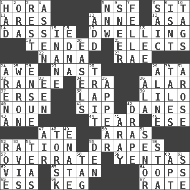 ACROSS 1. Israeli folk dance 5. Overdraft (abbr.) 8. Be seated 11. Ancient Greek god of war 12. Singer Murray 13. White ___ sheet 14. Hyrax 17. Home 19. Looked after 21. Opts 22. Nanny 23. Actress Charlotte 24. Deep reverence 27. Political cartoonist Thomas 29. _ moment's notice (2 wds.) 32. Indian princess (variant) 34. Epoch 36. Having or resembling wings 37. Celtic language 38. Pet locale 39. _ and Stitch 40. Part of speech 41. Small drink 42. Natives or inhabitants of Denmark 43. One (Scot) 44. Pull into pieces 46. Compass dir. 47. Had dinner 50. Ancient river in northeast Turkey 52. Food allowance for one day 55. Window treatments 57. Make much ado about nothing 59. Gossips 62. By way of 63. Comedian Laurel of Laurel & Hardy 64. I made a mistake 65. Double-curved letter 66. Barrel 67. Assign a rank or rating to DOWN 1. Possessed 2. Mouth or opening 3. Respite 4. NE Netherlands city 5. Compass dir. 6. Scornful expression 7. Man or boy (slang) 8. Ketch in the Levant 9. Is not 10. Labels 12. Increase 15. Lacking in sense or substance 16. Pulitzer Prize-winning author Ferber 18. Area sheltered from the wind 20. Artist's stands 24. Sports stadium 25. Make _____ (do battle with) 26. Follow as a consequence or result 28. Distinguishing feature 29. Place in a line 30. Stories 31. Came up 33. Car or cant ending 35. Seem 36. Insect wing 42. Window treatment 45. Like ___ of sunshine 47. Wind 48. Cod relative 49. Related on the mother's side 51. Sir (Sp.) 52. Be footloose 53. Opinion 54. Beverages made from leaves 55. Lair 56. Portico 58. Label 60. Fitting 61. Compass dir.