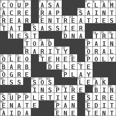 ACROSS 1. Clever action or accomplishment 5. White ___ sheet 8. Dollar (slang) 12. Measure of real estate 13. Strike 14. Inhabitant of Heaven 15. Located in or toward the back 16. Pleas 19. Make lace 20. More lively and spirited 21. A home for chicks 23. Heredity factor (abbr.) 24. Three (prefix) 27. Frog relative 30. Ache 31. Noteworthy scarcity 34. Taken by mouth 35. Margarine 38. Giggle 40. Many (prefix) 41. Sharp remark 42. Erase 44. Legendary monster 45. Shaw product 46. Double-curved letter 47. Distress signal 50. Path through which fluid escapes 53. Stimulate to action 57. Storage container 59. Supplying deficiencies 63. The founder of a family 64. Maternal 65. Baking dish 66. Prepare for publication 67. Opera by Verdi 68. Compass dir. 69. Portable shelter DOWN 1. Haul 2. Sea 3. A salt of uric acid 4. For each 5. Type of rug 6. Without 7. Flats, for short 8. Feline 9. Cards in a Roman deck? 10. A saturated hydrocarbon 11. Mountains (abbr.) 14. "Two Mules for Sister ____" 17. To free from 18. Car or cant ending 20. Portico 22. Disco prop 24. Edible starchy tuberous root 25. Monetary unit of Yemen 26. In an inward manner 28. Tate display 29. Passed on 30. Wimpy's pal 32. Definite Article 33. Sharp bark 35. Mitch Miller's instrument 36. Fails to keep up a pace 37. Blunders 39. Snakelike fish 43. Falsehood 47. Filth; sediment 48. Single 49. Fast jet (abbr.) 51. Remain 52. Japanese brewing company 54. Corncob 55. "Terrible" tsar 56. French philosopher Descartes 58. Remaining after all deductions 59. Ocean 60. Corn or form start 61. Writing tablet 62. Parent Teacher Assoc. 63. Arrange properly for use