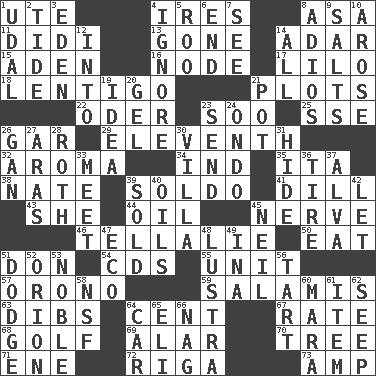 ACROSS 1. Shoshoni 4. Angers 8. White ___ sheet 11. "You Light Up My Life" star Conn 13. Went 14. The sixth month of the Jewish calendar 15. An important port of Yemen 16. Connecting point 17. _ and Stitch 18. Small, flat, pigmented spot on the skin 21. Schemes 22. Baltic tributary 23. "Barney Miller" actor Jack 25. Compass dir. 26. Slender fish 29. Veterans Day date 32. Odor 34. Working for oneself (abbr.) 35. Call ___ day 38. Nathan's nickname 39. Twentieth part of a lira 41. Deli pickle 43. A female animal or person 44. Lubricate 45. Boldness 46. Copy Pinocchio 50. Consume 51. Spanish title 54. Music discs 55. A single undivided whole 57. U. of Maine site 59. Deli grouping 63. Rights 64. Penny 67. Pace 68. _ course 69. Having or resembling wings 70. Woody plant 71. Compass dir. 72. Port city in Latvia 73. Electrical Unit DOWN 1. Hereditary estate 2. Periodic rise and fall of the sea level 3. Locale of original sin 4. Disregard 5. Friend of Pooh 6. Conclusion 7. Perceive with the eye 8. Goodbye (Sp.) 9. Table seasonings 10. Came up 12. To the inside or interior of 14. Everything 19. It may be bright or harebrained 20. Set 21. Cooking vessel 23. Post 24. Southwest Nigerian state 26. Separate the seeds from cotton 27. Caspian sea tributary 28. Writer of Portnoy's Complaint (1969) 30. Country estate 31. Flintstone garb 33. Confront 36. Hoop that covers a wheel 37. Inventor's middle name 39. Exchanged or delivered for money 40. Petroleums 42. Allow 45. Famous astronaut Armstrong 47. Environmental prefix 48. A period of five years 49. _ tizzy (2 wds.) 51. Evade 52. Constellation of myth 53. Impressive in appearance 56. Small pie 58. Overdraft (abbr.) 60. Hindu Mythology: god of death 61. Detail 62. Ooze 64. 4-wheeled motor vehicle 65. Biblical high priest 66. Tired old horse