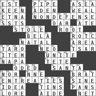 ACROSS 1. Eastern Standard Time (abbr.) 4. Corncob 8. At sea 12. Peachy ____! 14. Arabian gulf 15. Welt 16. Inactive volcano in Sicily 17. Unrelated to defense, as in spending 20. Fast planes 21. Boat paddle 22. Had dinner 23. Fur scarf 27. Carrot, for example 29. Actor Lugosi 31. College mil. group 34. Relating to or accompanying birth 35. Length times width 36. Pacific island yam 39. Modern: prefix 41. Russian ruler of old 42. A whole individual unit 43. Join together 46. California wine valley 47. False hair 48. Wrote a lyric poem 51. Before Barbara or Clara 54. And not 56. Compass dir. 58. Naughty child 61. Pleas 66. Trig term 67. It may be bright or harebrained 68. Metal containers 69. Zero-star reviews 70. Old wives' tales, e.g. 71. Assistant 72. Fish or hair follower DOWN 1. Supplements with great effort 2. Arranges properly for use 3. Portable shelters 4. Baking dish 5. Wedding promise 6. Writing instrument 7. Inside; within (prefix) 8. Deep reverence 9. Legislators 10. Compass direction 11. Toward shelter 13. Political cartoonist Thomas 18. Hearing organ 19. From 24. Chief or king in Benin or Nigeria 25. Allow 26. Liveliness 28. Speak pompously 30. Eskimo relative 32. Afternoon social gathering 33. Auto 34. Roamer 36. Shallow baking pan 37. _ moment's notice (2 wds.) 38. Newsperson 40. Singles 44. Call ___ day 45. "___ Little Indians" 49. Compass dir. 50. Heredity factor (abbr.) 52. Cook's measure (abbr.) 53. Believer in; advocate of (suffix) 54. Famous astronaut Armstrong 55. Southwest Nigerian state 57. Singer James 59. Queen of England 1702-14 60. Trial 62. Actress Charlotte 63. One more than two 64. Conclude 65. Compass dir.