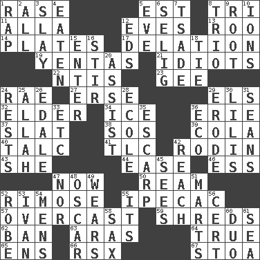 ACROSS 1. To erase 5. Eastern Standard Time (abbr.) 8. Three (prefix) 11. Silent film actress Nazimova 12. Nights before holidays 13. Friend of Pooh 14. Food holders 17. Accusation by an informer 19. Gossips 21. Foolish or stupid persons 22. Nuclear Threat Initiatives 23. Turn to the right 24. Actress Charlotte 27. Celtic language 29. Raised railways 32. A person who is older than you are 34. Frozen water 36. One of the Great Lakes 37. Narrow board 38. Mayday 39. Root beer relative 40. Baby powder 41. Affectionate concern, for short 42. "The Thinker" sculptor 43. A female animal or person 44. Relaxation 46. Double-curved letter 47. At this time 50. 480, 500 or 516 sheets of paper 52. Full of chinks, cracks, or crevices 55. Medicinal drug used to evoke vomiting 57. Cloudy 59. Tears up 62. Forbid 63. Caspian sea tributary 64. Loyal 65. Followers of ems 66. Acura sports coupe 67. Portico DOWN 1. Strike 2. Everything 3. Kill 4. Ingested 5. Night before a holiday 6. Former Milwaukee Brewers owner Bud 7. Sadhe (variant) 8. Musical group of three 9. Carrot, for example 10. Charged atoms 12. Begley and Asner 15. Keyboard key 16. Move through with a circular motion 18. Neckwear 20. Aid 24. Musical pauses 25. Assad's deity 26. Peak District village in England 28. Learning spot: Fr. 29. Eat (away) 30. Ms. Damita and namesakes 31. Actors Connery and Penn 33. And so on (abbr.) 35. Fortification 36. Environmental prefix 42. Arrive at 45. Perceives with the eye 47. Or not 48. Motion picture award 49. Erodes 51. Shops 52. Loose flowing garment 53. "Terrible" tsar 54. Not women's 55. ___ a Wonderful Life 56. An absolute certainty 58. Saxophone 60. Superhero pair 61. Ocean