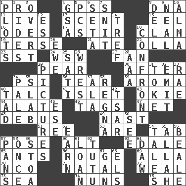 ACROSS 1. Adept person 4. Global Positioning Systems (abbr.) 8. Heredity factor (abbr.) 11. Not recorded 13. Odor 15. Snakelike fish 16. Lyric poems 17. Moving about 18. Burrowing marine mollusk 19. Laconic 21. Had dinner 22. Rounded earthenware pot or jar 23. Fast jet (abbr.) 24. Compass dir. 27. Air blower 29. Lightbulb-shaped fruit 30. Following 34. Air pressure measure (abbr.) 36. Lacerate 39. Odor 40. Baby powder 41. Small island 43. Migrant worker of the '30s 44. Having winglike extensions 46. Labels 47. Fish or hair follower 48. To get out of a bus 49. Political cartoonist Thomas 51. To sift 53. "We ___ not amused" (Victoria) 54. Keyboard key 57. Airs 60. Keyboard modifier key 63. Peak District village in England 65. Pismires 66. Makeup applied to the cheeks 69. Silent film actress Nazimova 70. Non-commissioned officer (abbr.) 71. Relating to or accompanying birth 72. Welt 73. Ocean 74. Religious women 75. A female animal or person DOWN 1. Schemes 2. Amusement-park features 3. Unconcealed 4. Girls' org. (abbr.) 5. Personal Computers (abbr.) 6. Bristle 7. In a ____ (agitated or irritated) 8. Small valley 9. Actress Patricia 10. _ mater 12. Curvy letter 14. Unclean, religiously 18. Meet 20. She-sheep 25. Suttee (variant) 26. Obtain by seizing forcibly or violently 28. Auto club (abbr.) 29. Photos 31. Casino tip 32. Send forth 33. Actress Charlotte 34. Diluted with white 35. Thick slice 37. Wing 38. Rain (Swedish) 40. Bit 42. Russian ruler of old 45. Compass dir. 50. Perceive with the eye 52. Merit 54. Lies 55. Assad's deity 56. Calif. Air Force Base 57. Zero-star reviews 58. At one time in the past 59. Portico 61. Grant temporary use of 62. Ballerina skirt 64. Fool 67. Separate the seeds from cotton 68. Raised railways