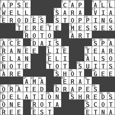 ACROSS 1. Domed church section 5. Head covering 8. 100% 11. Water source 12. "Two Mules for Sister ____" 13. By way of 14. Eats (away) 17. Discontinuing 19. Cigar-shaped 21. Makes clutter 22. Printing process, for short 23. Tate display 24. Adept person 27. Raised platform 29. Health resort 32. Indian princess (variant) 34. Untruth 36. Pull apart 37. Liveliness 38. Biblical high priest 39. In addition 40. Musical sound 41. Small child 42. Sets of matching outer garments 43. "We ___ not amused" (Victoria) 44. Went for two points 46. Unit of force equal to gravity 47. Nursemaid (var.) 50. Part of Q.E.F. 52. Declaimed 55. Window treatments 57. Accusation by an informer 59. Tears up 62. Single 63. Round or rotation of duties 64. Native of Scotland 65. To separate or throw off 66. Eastern Standard Time (abbr.) 67. Inactive volcano in Sicily DOWN 1. Deep reverence 2. For each 3. Position in a hierarchy or organization 4. A person who is older than you are 5. Feline 6. Scent 7. Some stationery 8. Deliberation 9. Actor's bit 10. Falls behind 12. Compass dir. 15. Eat (away) 16. Bristle 18. Pacific Standard Time (abbr.) 20. Bathroom 24. Sports stadium 25. Bodily heat indicating an inflammation 26. Maternal 28. Grain storage towers 29. Major League Baseball Commissioner Bud 30. Thick mixture 31. Came up 33. Compass dir. 35. One or the other of two 36. The 19th letter of the Greek alphabet 42. Staphylococcus 45. Mouths or openings 47. _ moment's notice (2 wds.) 48. Distance measurement (Brit.) 49. Goodbye (Sp.) 51. Laconic 52. Scent 53. French philosopher Descartes 54. Toward shelter 55. Heredity factor (abbr.) 56. Religious group 58. Baseball player Mel 60. Spanish title 61. R.R. building
