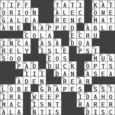 ACROSS 1. Small quarrel 5. Jacques of French films 9. Krazy ___ of comics 12. Greek mythologigal hunter 14. Actor Baldwin 15. Single 16. An organ shaped like a helmet 17. French philosopher Descartes 18. Floor protector 19. One (Scot) 20. Slept 23. Competent 24. Root beer relative 25. Shade of tan 27. South American Indian 30. White ___ sheet 32. ___ good deed 33. Trust 34. Capri or Wright 36. 23rd letter of the Greek alphabet 38. "Barney Miller" actor Jack 39. Greek goddess of the dawn 40. Java container 43. Writing tablet 46. Evade 48. Chooses 49. One more than two 51. Daniel's nick name 52. At sea 53. Arabian gulf 54. Tail end 56. Ear part 58. Wine fruits 61. Fast jet (abbr.) 64. Retirement account (abbr.) 65. Shed a tear 66. Potato state 68. Apple computer (short form) 69. Is not 70. More uncommon 71. Wing 72. Nuclear Threat Initiatives 73. Flat circle DOWN 1. Ancient Roman robe 2. SW Asia republic 3. Do some clerical work 4. Enemy 5. Canvas cover 6. Toward shelter 7. Watched over 8. Frozen water 9. Dried seaweed eaten as food 10. Of or related to the anus 11. False hair 13. Billionth: prefix 21. Mountain range southwest of Kyrgyzstan 22. Went by 23. Ancient river in northeast Turkey 24. Island 26. Police officer (slang) 27. Big collection agency 28. Modern: prefix 29. Hoof sound 31. Verbally 35. Fortification 37. Naughty children 41. Shoshoni 42. Girls' org. (abbr.) 44. Assistant 45. Expire 47. Leg joint 48. Boat paddle 50. Consume 53. Phillipine bananalike plant 55. SW Saudi Arabia district 56. Pale green bean 57. Taken by mouth 59. Painter Guido (1575-1642) 60. Tenement units (abbr.) 61. Indian skirt 62. "______ My Girl" (Turtles hit) 63. Torque (variant) 65. Victory 67. Male parent