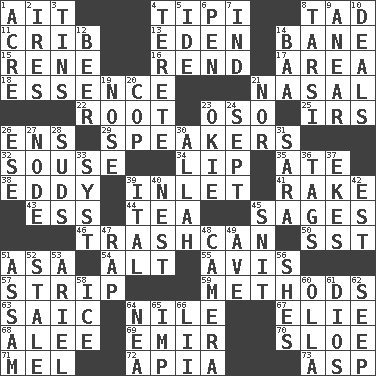 ACROSS 1. Small island 4. Native american tent (variation) 8. Small amount or degree 11. Baby bed with high sides 13. Locale of original sin 14. Object of repulsion 15. French philosopher Descartes 16. Tear apart 17. Type of rug 18. Center 21. Relating to the nose 22. Carrot, for example 23. Bear (Spanish) 25. Big collection agency 26. Followers of ems 29. Orators 32. Lush 34. Mouth edge 35. Had dinner 38. Whirlpool 39. An arm off of a larger body of water 41. Immoral or dissolute person 43. Double-curved letter 44. Afternoon social gathering 45. Gurus 46. File 13 50. Fast jet (abbr.) 51. White ___ sheet 54. Keyboard modifier key 55. Deliberation 57. Empty completely 59. Modes 63. Ketch in the Levant 64. The longest river in the world 67. Writer Wiesel 68. Toward shelter 69. Arab leader 70. A type of plum 71. Cartoonist voice _ Blanc 72. Capital of Western Samoa 73. Cleo's killer DOWN 1. Land measure 2. Angers 3. Metal containers 4. Cigar-shaped 5. Binary compound 6. Animal enclosure 7. Working for oneself (abbr.) 8. Tarsus (plural) 9. Approach 10. Allots cards 12. Fermented drink made from hops 14. Sound made by sheep 19. Olfactory organ 20. Police officer (slang) 21. Not either 23. Migrant worker of the '30s 24. Back-to-school mo. 26. Compass dir. 27. Connecting point 28. Soap bubbles 30. Assad's deity 31. "Two Mules for Sister ____" 33. System (abbr.) 36. Labels 37. Supplements with great effort 39. Slanted text style (abbr.) 40. A home for chicks 42. Eastern Standard Time (abbr.) 45. In a ____ (agitated or irritated) 47. Hit sharply and swiftly 48. Device for capturing images 49. "___ Maria" 51. Indian state 52. Having lost freshness 53. Satellite of Uranus 56. "______ My Girl" (Turtles hit) 58. Frozen water 60. Spanish pot 61. "Vaya con ____" 62. Ooze 64. Teachers' org. 65. Naughty child 66. Cards in a Roman deck?