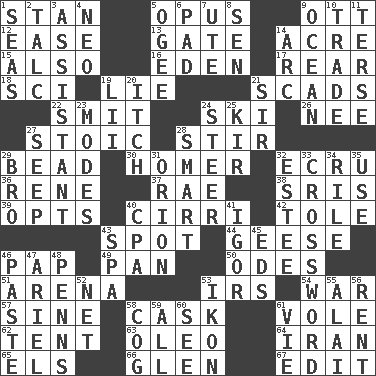 ACROSS 1. Comedian Laurel of Laurel & Hardy 5. Musical composition 9. Baseball player Mel 12. Relaxation 13. Yard entry 14. Measure of real estate 15. In addition 16. Paradise 17. Hitchcock's "____ Window" 18. _-fi 19. Falsehood 21. Large numbers or amounts 22. Stricken, poetically 24. What Jean-Claude Killy likes to do 26. Born 27. Unemotional 28. Agitate 29. Necklace unit 30. Simpsons dad 32. Shade of tan 36. French philosopher Descartes 37. Actress Charlotte 38. Indian titles of respect 39. Chooses 40. High-altitude cloud 42. Lacquered or enameled metalware 43. Specific locale 44. Honkers 46. Infant food 49. Baking dish 50. Lyric poems 51. Sports stadium 53. Big collection agency 54. Armed conflict 57. Trig term 58. Keg 61. Grand slam 62. Portable shelter 63. Butter sub 64. SW Asia republic 65. Raised railways 66. Small, secluded valley 67. Prepare for publication DOWN 1. Oceans 2. Baby powder 3. Aide 4. Modern: prefix 5. Double curve, resembling the letter S 6. Writing tablet 7. Shoshoni 8. Elected rep. 9. Sea 10. Barter 11. Laconic 14. Curve 19. Cards in a Roman deck? 20. Hankering 21. Title for a knight 23. Methods 24. Bull 25. Apertif with cassis 27. Ooze 28. Don Adams' spy role 29. Sis' sibling 31. Greek mythologigal hunter 32. First name in cosmetics 33. What you're doing now 34. Cause heat under the collar 35. Purpose 40. Numbers guy (abbr.) 41. Composer Stravinsky 43. Health resort 45. Begley and Asner 46. Thick mixture 47. Satellite of Uranus 48. Actor Sean's family 52. Fish or hair follower 53. Picture 55. Mountain range southwest of Kyrgyzstan 56. Monthly bill 58. Gear tooth 59. 100% 60. Observe 61. Compete