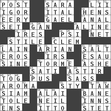 ACROSS 1. Mail 5. "Two Mules for Sister ____" 9. Cards in a Roman deck? 12. Composer Stravinsky 13. Slanted text style (abbr.) 14. Coop moms 15. Suggestive of the supernatural 16. Highlander 17. Of or related to the anus 18. Put into a specified state 19. Separate the seeds from cotton 21. Place in a line 22. Angers 24. 23rd letter of the Greek alphabet 26. Fish or hair follower 27. Vertical member of a panel or frame 28. To starve (Brit.) 29. (Had) reclined 30. Believer in; advocate of (suffix) 32. Table seasoning 36. Greek god of love 37. Big collection agency 38. He sold his birthright 39. Trig term 40. Singer Mel 42. American tennis player Robert 43. Suttee (variant) 44. Having gotten out of bed 46. Coat; cloak 49. Suppuration 50. Backtalk 51. Odor 53. Filthy place 54. The 23rd letter of the Hebrew alphabet 57. Thailand, formerly 58. Jai _ 61. Object of repulsion 62. Lacquered or enameled metalware 63. Famous astronaut Armstrong 64. Taverns 65. Followers of ems 66. "Tell ____ the Marines!" 67. Proofreading order DOWN 1. Sliced desserts 2. Double curve, resembling the letter S 3. Determination 4. Attempt to accomplish something 5. Signal 6. "One Day ___ Time" 7. Actress Charlotte 8. Everything 9. Soviet premier 1918-24 10. Empty; void 11. Small island 14. Actor Linden 19. Set 20. Toward the sea 21. Direct toward a target or goal 23. Wash lightly 24. Suffix with ecto or cyto 25. Elected rep. 27. Indian skirt 28. High-altitude cloud 29. French article 31. Disturbances 32. Theater features 33. Aide 34. Cowardly lion portrayer 35. Third day of the wk. 40. The 19th letter of the Greek alphabet 41. Compass direction 43. Health resort 45. Declare 46. Clothes sense 47. Greek mythologigal hunter 48. Finish lines 52. Madame (abbr.) 53. Grain storage tower 55. Singer Murray 56. 270 degrees 58. Cuckoo 59. Allow 60. Small island 61. Altar cloth linen