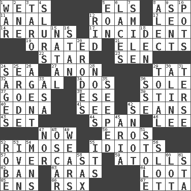 ACROSS 1. Soaks 5. Raised railways 8. Viper 11. Of or related to the anus 12. Wander 13. Lion 14. Summer TV shows 17. Event 19. Spoke pompously 21. Opts 22. Play the lead 23. Elected rep. 24. Ocean 27. Soon (poet.) 29. Make lace 32. Therefore, facetiously 34. Two (Sp.) 36. Not divided or shared with others 37. Travels 38. Compass dir. 39. Agitate 40. Pulitzer Prize-winning author Ferber 41. Perceive with the eye 42. Actors Connery and Penn 43. Arrange properly for use 44. Connect, as a bridge 46. Area sheltered from the wind 47. Immediately 50. Greek god of love 52. Full of chinks, cracks, or crevices 55. Foolish or stupid persons 57. Cloudy 59. Ringlike coral islands and reefs 62. Forbid 63. Ancient river in northeast Turkey 64. Plunder 65. Followers of ems 66. Acura sports coupe 67. Singer James DOWN 1. Armed conflict 2. Compass dir. 3. Pacific island yam 4. Plays smoothly or legato 5. Period of immesurable duration 6. Shoestrings 7. Grin 8. Actor Baldwin 9. Emitted 10. Cooking vessels 12. To free from 15. Brizilian seaport 16. Comedian Laurel of Laurel & Hardy 18. Lair 20. Eats (away) 24. Gurus 25. Wear away 26. Rep 28. Olfactory organs 29. Add up to 30. Place in a line 31. Laconic 33. White ___ sheet 35. Oozed 36. Compass dir. 42. Snob 45. Operatic vocal solo 47. And not 48. Witty Wilde 49. Puts on (as clothing) 51. Fur scarf 52. Loose flowing garment 53. "Terrible" tsar 54. Not women's 55. ___ a Wonderful Life 56. Slit 58. Saxophone 60. Car dealer's back yard 61. R.R. building