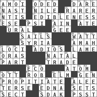 ACROSS 1. Mine, in Marseilles 5. Wrote a lyric poem 9. Have the gumption 13. Political cartoonist Thomas 14. Mediterranean tributary 15. More valued for its uncommonness 16. Nuclear Threat Initiatives 17. The property of being fit to eat 19. Compass dir. 20. 23rd letter of the Greek alphabet 21. The 18th letter of the Arabic alphabet 22. Had dinner 23. Mountain range 25. Unit of force equal to gravity 26. Travel by water 30. Electrical Unit 34. Damascus' land 35. Nursemaid 36. Event scenes 39. Goodbye (Sp.) 42. Unable to walk 43. Mouths or openings 44. Relating to or accompanying birth 46. Component 47. Buy and sell 48. Environmental prefix 51. Smallest unit of an element 54. Baseball player Mel 57. Director Reiner 58. Shade tree 60. Commissioned military rank (abbr.) 62. Conciliate 65. Toward shelter 66. Laconic 67. Pulitzer Prize-winning author Ferber 68. Arranges properly for use 69. Religious group 70. Neighbor of Neb. 71. Inconspicuous attention getter DOWN 1. Singer Murray 2. Taiwanese island in East China Sea 3. Flexible twig of a willow tree 4. It is 5. Washington bills 6. "You Light Up My Life" star Conn 7. Connecticut Ivy Leaguer 8. Debunk (Brit. slang) 9. One of the 12 tribes of Israel 10. Length times width 11. Relief 12. Celtic language 15. French philosopher Descartes 18. Falsehood 20. Romp 24. Help 27. Lyricist Gershwin 28. Flaplike covering 29. Virtuous person 30. Place for singles 31. Wet nurse (var.) 32. Scottish cap 33. Definite Article 36. Chop off 37. Mouth or opening 38. Auto 40. Boat paddle 41. R.R. building 45. First man 48. One of the Great Lakes 49. Small bed 50. Off-Broadway awards 52. Stares 53. Confronts 54. Elects 55. Family _ (genealogy) 56. Torque (variant) 58. Inactive volcano in Sicily 59. Path through which fluid escapes 61. A home for chicks 63. Pacific Standard Time (abbr.) 64. Increase 65. Viper
