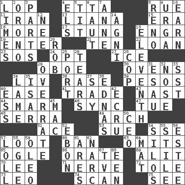 ACROSS 1. Trim (branches) 4. Singer James 8. Regret 11. SW Asia republic 13. Climbing, woody, usually tropical vines 15. Epoch 16. Greater amount 17. Feeling sharp psychological pain 18. Engineer (abbr.) 19. Keyboard key 21. Nine, plus one 22. Grant temporary use of 23. Mayday 24. Choose 27. Frozen water 29. Mitch Miller's instrument 30. Baking chambers 34. 54 in ancient Rome 36. To erase 39. Mexican monetary units 40. Comfort 41. Swap 43. Political cartoonist Thomas 44. Excessive but superficial compliments 46. Synchronize (abbr.) 47. Third day of the wk. 48. Spanish missionary in California 49. Bowlike part 51. Adept person 53. Take to court 54. Compass dir. 57. Plunder 60. Prohibit 63. Leaves out 65. Stare at amorously 66. Speak pompously 69. Came down and settled, as after flight 70. Area sheltered from the wind 71. Effrontery 72. Lacquered or enameled metalware 73. Lion 74. Skim 75. Perceive with the eye DOWN 1. Citrus fruits 2. U. of Maine site 3. Components 4. Raised railways 5. Teat (slang) 6. Strained 7. Singer Murray 8. Former U.S. Attorney General Janet 9. Capital and largest city of Mongolia 10. Merit 12. Born 14. Hindu god of fire 18. Veterans Day date 20. Director Reiner 25. Sweet dark-red dessert wine 26. Pulls into pieces 28. Police officer (slang) 29. Make much ado about nothing 31. He sold his birthright 32. Sense of smell 33. Fast jet (abbr.) 34. Unable to walk 35. Austrian river, tributary to the Danube 37. Declare 38. Ferber et al. 40. Double-curved letter 42. Shade of tan 45. Big _ 50. Corporate head (abbr.) 52. Inky black, to poets 54. Grain storage towers 55. Vertical member of a panel or frame 56. First name in cosmetics 57. Hang loosely or laxly 58. Double curve, resembling the letter S 59. Butter sub 61. Ancient Greek god of war 62. Drug cop 64. Floor protector 67. Federal power corp. 68. Car or cant ending