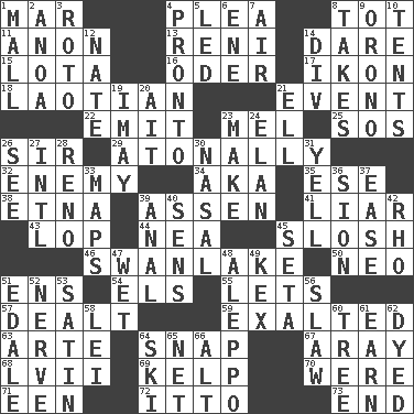 ACROSS 1. Make imperfect 4. Entreaty 8. Small child 11. Soon (poet.) 13. Painter Guido (1575-1642) 14. Have the gumption 15. Globular water bottle used in Asia 16. River in Europe 17. Visual representation of an object 18. Of or relating to Laos or its people 21. Happening 22. Give off 23. Cartoonist voice _ Blanc 25. Distress signal 26. Title for a knight 29. Lacking a tonal center or key 32. Foe 34. Alias (abbr.) 35. Compass dir. 38. Inactive volcano in Sicily 39. NE Netherlands city 41. One who doesn't tell the truth 43. Chop off 44. Teachers' org. 45. Agitate, as a liquid 46. Tchaikovsky ballet 50. Modern: prefix 51. Followers of ems 54. Raised railways 55. Allows 57. Started a card game 59. Honored 63. Johnson of "Laugh-In" 64. Fastener 67. Like ___ of sunshine 68. 57 in ancient Rome 69. Seaweed 70. We are 71. Car or cant ending 72. "Tell ____ the Marines!" 73. Conclude DOWN 1. Promenade 2. Small Philippine buffalo 3. Printing process, for short 4. Right away 5. Directed 6. Compass dir. 7. Wind 8. Proceeds 9. U. of Maine site 10. Portable shelters 12. Nathan's nickname 14. HTML Container Element 19. "If ____ say so..." 20. Small island 21. Pipe bend 23. Create 24. Liveliness 26. Perceive with the eye 27. International (abbr.) 28. Former U.S. Attorney General Janet 30. Rhinal 31. Shout 33. Atlas contents 36. The Jewish people; Israel 37. Relaxation 39. Of or related to the anus 40. Elected reps. 42. 17th letter of the Greek alphabet 45. Stalk of a moss capsule 47. Dripping 48. City in Syria 49. A weed 51. Peak District village in England 52. Impudent aggressiveness 53. Smooth fabric 56. Cole _ (cabbage dish) 58. Flowery wreath 60. Family _ (genealogy) 61. Merit 62. Colored 64. What Jean-Claude Killy likes to do 65. Fish or hair follower 66. The first octave above the treble staff