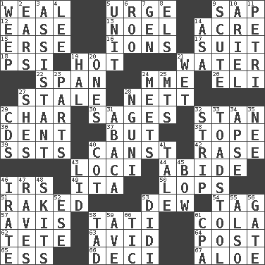 ACROSS 1. Welt 5. Goad 9. Plant excrement 12. Relaxation 13. Christmas carol 14. Measure of real estate 15. Celtic language 16. Charged atoms 17. Costume for a special activity 18. 23rd letter of the Greek alphabet 19. Being at a high temperature 21. Wetness 22. Connect, as a bridge 24. Madame (abbr.) 26. Biblical high priest 27. Showing deterioration from age 28. Remaining after all deductions 29. Burn to charcoal 30. Gurus 32. Comedian Laurel of Laurel & Hardy 36. Incision 37. With the exception that 38. Drink excessively 39. Fast planes 40. 2nd pers. sing. pres. of can (arch.) 42. Raze (variant) 43. Venues 44. Remain 46. Big collection agency 49. Call ___ day 50. Chops off 51. Swept the length of 53. Morning condensation 54. Label 57. Deliberation 58. Jacques of French films 61. Root beer relative 62. False hair 63. Enthusiastic 64. Mail 65. Double-curved letter 66. Tenth: prefix 67. Medicinal plant DOWN 1. Shed a tear 2. Hearing organs 3. Aide 4. Area sheltered from the wind 5. A single undivided whole 6. Friend of Pooh 7. Commissioned mil. rank 8. Raised railways 9. Snake scale 10. Satellite of Uranus 11. _ dish (used to culture cells) 14. White ___ sheet 19. Actor Linden 20. Washington bills 21. Dripping 23. Actors' quests 24. Confronts 25. Mountains (abbr.) 27. "______ My Girl" (Turtles hit) 28. Group of southern Bantu languages 29. Music discs 31. Phillipine bananalike plant 32. Remove all contents or possession from 33. Inedible or poisonous agaric 34. Domed church section 35. Born 40. Small bed 41. Falsehood 43. Hat (slang) 45. Ribbon knot 46. Feeling or showing extreme anger 47. All-night dance parties 48. Burlesque acts 52. Compass dir. 53. "You Light Up My Life" star Conn 55. In addition 56. Yard entry 58. Bit 59. "___ Maria" 60. Nervous spasm 61. Tax preparer (abbr.)