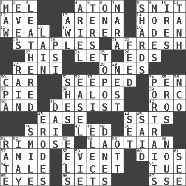 ACROSS 1. Cartoonist voice _ Blanc 4. Tiny particle 8. Stricken, poetically 12. "___ Maria" 13. Sports stadium 14. Israeli folk dance 15. Welt 17. One who wires 18. An important port of Yemen 19. Paper fasteners 21. Anew 23. Part of HMS, perhaps 24. Allow 26. Begley and Asner 27. Painter Guido (1575-1642) 28. Washington bills 30. Automobile 31. Oozed 34. Fenced enclosure 37. Sliced dessert 38. Auras 39. The grampus (Milton) 40. Also 41. Cease 42. Friend of Pooh 43. Relaxation 44. Fast planes 46. _ Lanka 47. Directed 50. Hearing organ 51. Full of chinks, cracks, or crevices 54. Of or relating to Laos or its people 57. Among 58. Happening 60. "Vaya con ____" 62. Lie 63. It is permitted: Lat. 64. Third day of the wk. 65. Snake ____ (dice throw) 66. Puts into a specified state 67. Compass dir. DOWN 1. Informal term for the mouth 2. Nights before holidays 3. Resembling or made to resemble leather 4. Satellite of Uranus 5. Laconic 6. Single 7. Hindu Mythology: god of death 8. Broken pieces 9. Methods 10. Angers 11. Hyperbolic tangent 13. Leather borer 16. (Had) reclined 20. 23rd letter of the Greek alphabet 22. Nourish 25. Traditional theme or motif 27. Precipitation 29. Egg locale 30. Accounting whiz (abbr.) 31. "______ My Girl" (Turtles hit) 32. Artist's stand 33. Biblical high priest 34. Likenesses of persons 35. Greek god of love 36. Non-commissioned officer (abbr.) 41. Raised platform 43. Eats (away) 44. Put into a specified state 45. Alleged 46. Grin 48. Opt 49. Natives or inhabitants of Denmark 51. Pace 52. "If ____ say so..." 53. Snakelike fish 55. Baseball player Mel 56. Good sense 59. Compete 61. Observe