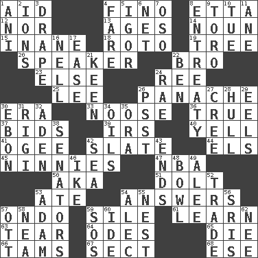 ACROSS 1. Assist 4. Fine (Spanish) 8. Singer James 12. And not 13. Matures 14. Part of speech 15. Silly 18. Printing process, for short 19. Relationship diagram 20. Orator 22. Sis' sibling 23. Otherwise 24. To sift 25. Area sheltered from the wind 26. Flamboyance 30. Epoch 33. Trap for birds or small mammals 36. Loyal 37. Auction offers 39. Big collection agency 40. Shout 41. Double curve, resembling the letter S 42. Schedule 44. Raised railways 45. Simpletons 47. Basketball assoc. 50. Alias (abbr.) 51. Stupid person 53. Had dinner 54. Responses 57. Southwest Nigerian state 59. Filth; sediment 61. Acquire or gain knowledge or skills 63. Pull into pieces 64. Lyric poems 65. Pass on 66. Scottish caps 67. Religious group 68. Compass dir. DOWN 1. Black tropical American cuckoo 2. Charged atoms 3. Window treatment 4. Conductor's collection 5. Composer Stravinsky 6. Fish or hair follower 7. Bear (Spanish) 8. Plea 9. "Corrida" creature 10. Third day of the wk. 11. One (Scot) 16. 1994 drama film starring Jodie Foster 17. Comfort 21. Peachy ____! 22. Benjamin's nick name 24. Actress Charlotte 26. Inconspicuous attention getter 27. Algonquian 28. Frame or body of a ship 29. Snakelike fish 30. Inky black, to poets 31. Swiss mountan, "Queen of the Mountains" 32. Arabian gulf 34. Lubricates 35. Mouth or opening 38. Legislators 42. Ocean 43. Conclusions 46. Eisenhower's nickname 48. Soup holder 49. Toward shelter 52. Barter 53. First of billions? 54. Actor Baldwin 55. Egg locale 56. Indian titles of respect 57. Baseball player Mel 58. Teachers' org. 59. Distress signal 60. Binary compound 62. Born