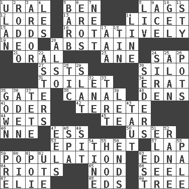 ACROSS 1. Mountain range 5. Benjamin's nick name 8. Fails to keep up a pace 12. Old wives' tales, e.g. 13. "We ___ not amused" (Victoria) 14. It is permitted: Lat. 15. Does sums 16. Producing rotation 19. Modern: prefix 20. Choose not to consume 21. Relating to the mouth 23. One (Scot) 24. Plant excrement 27. Fast planes 30. Grain storage tower 31. Bathroom 34. Part of Q.E.F. 35. Yard entry 38. Lessep's creation 40. Habitations of wild animals 41. Baltic tributary 42. Cigar-shaped 44. Moistens 45. Pull apart 46. Compass dir. 47. Curvy letter 50. One who makes use of a thing 53. Curse 57. Pet locale 59. Census information 63. Pulitzer Prize-winning author Ferber 64. Debaucheries 65. Allow head to fall sleepily 66. Stitch closed the eyes of (a falcon) 67. Writer Wiesel 68. Begley and Asner 69. Family _ (genealogy) DOWN 1. ____ Bator, Mongolia 2. Cowboy competition 3. Zeal 4. French article 5. Sharp remark 6. Greek god of love 7. Remaining after all deductions 8. 54 in ancient Rome 9. Adept person 10. Set 11. Filthy place 14. Actor's bit 17. Auto club (abbr.) 18. Shallow baking pan 20. In addition 22. Michaelmas daisies 24. Male parent of an animal 25. ____ Jay Lerner 26. Cooking vessels 28. Nervous spasm 29. Narrow board 30. Spring feasts 32. Compass dir. 33. Small pie 35. Long dress 36. An important port of Yemen 37. Wig 39. Area sheltered from the wind 43. Pulled tight 47. Snakelike fish 48. Health resort 49. Be seated 51. A person who is older than you are 52. Indian princess (variant) 54. Prong on a fork 55. Parka part 56. Conclusions 58. Light colored 59. Before (prefix) 60. Lubricate 61. Luau course 62. Shoshoni 63. Eastern Standard Time (abbr.)