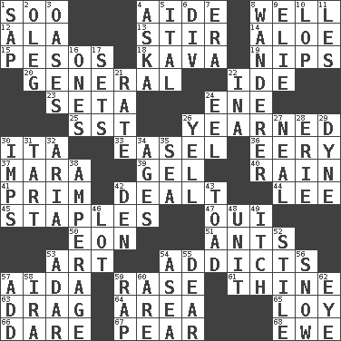 ACROSS 1. "Barney Miller" actor Jack 4. Helper 8. Water source 12. According to 13. Use a swizzle stick 14. _ vera 15. Mexican monetary units 18. Polynesian shrub of the pepper family 19. Pinches, bites 20. Commissioned military rank 22. Binary compound 23. Stalk of a moss capsule 24. Compass dir. 25. Fast jet (abbr.) 26. Had a strong desire 30. Call ___ day 33. Artist's stand 36. Suggestive of the supernatural 37. Hindu Mythology: god of death 39. Set 40. Precipitation 41. Demure 42. Started a card game 44. Area sheltered from the wind 45. Paper fasteners 47. Fr. "Yes" 50. Period of immesurable duration 51. Pismires 53. Tate display 54. Inveterate users 57. Opera by Verdi 59. Raze (variant) 61. One or ones belonging to thee 63. To draw with force 64. Length times width 65. Myrna of the movies 66. Have the gumption 67. Lightbulb-shaped fruit 68. She-sheep DOWN 1. Plant excrement 2. Cassini of fashion 3. Fertile tracts in a desert 4. "____ silly question..." 5. Slanted text style (abbr.) 6. HTML Container Element 7. Period 8. Roamer 9. Writer Wiesel 10. Trim (branches) 11. French article 16. Singles 17. Arranges properly for use 21. Pace 22. _ tizzy (2 wds.) 24. Snakelike fish 26. Shout 27. Actress Patricia 28. One of the Great Lakes 29. Unit of force 30. Naughty children 31. Small pie 32. Operatic vocal solo 34. Matures 35. Ocean 38. Electrical Measurement 42. Lair 43. Frog relative 46. Car dealer's back yard 48. A single undivided whole 49. Hankering 52. Vertical member of a panel or frame 53. The sixth month of the Jewish calendar 54. At sea 55. Letter starter 56. Overwhelm 57. Say or write further 58. Retirement account (abbr.) 59. Reproach for some lapse or misdeed 60. "We ___ not amused" (Victoria) 62. Sight organ