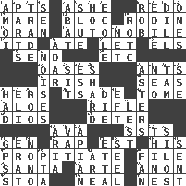 ACROSS 1. Flats, for short 5. American tennis player Robert 9. Do over again 13. Female horse 14. Group of countries in special alliance 15. "The Thinker" sculptor 16. Northwest Algerian city 17. Car 19. It would 20. Had dinner 21. Allow 22. Raised railways 23. Transmit 25. And so on (abbr.) 26. Fertile tracts in a desert 30. Pismires 34. From or relating to Ireland 35. Oceans 36. Possessive pronoun 39. Sadhe (variant) 42. Heavy book 43. Medicinal plant 44. Ransack; plunder; pillage 46. "Vaya con ____" 47. Prevent from occurring 48. Actress Gardner 51. Fast planes 54. Commissioned military rank (abbr.) 57. Hit sharply and swiftly 58. Eastern Standard Time (abbr.) 60. Part of HMS, perhaps 62. Appease 65. Do some clerical work 66. Before Barbara or Clara 67. Johnson of "Laugh-In" 68. At once, immediately (arch.) 69. Portico 70. Be tempered by heat 71. A home for chicks DOWN 1. Mine, in Marseilles 2. Actors' quests 3. Swap 4. Elected rep. 5. Blind as ____ 6. Turn sharply 7. Being at a high temperature 8. Learning spot: Fr. 9. Director Reiner 10. Singer Brickell 11. Deli pickle 12. Singles 15. College mil. group 18. Was introduced to 20. The sixth month of the Jewish calendar 24. Annoying sounds 27. Be seated 28. Double-curved letter 29. Pottery fragment 30. Michaelmas daisies 31. Modern: prefix 32. Scottish cap 33. Compass dir. 36. Possessed 37. Connecticut Ivy Leaguer 38. Friend of Pooh 40. Pass on 41. Bank Draft (abbr.) 45. For fear that 48. Operatic vocal solo 49. Large container 50. Bee-related 52. One or ones belonging to thee 53. Grain storage towers 54. Global Positioning Systems (abbr.) 55. Part of Q.E.F. 56. Words to Nanette 58. Singer James 59. Stitch closed the eyes of (a falcon) 61. Transmitted 63. Parent Teacher Association (abbr.) 64. "We ___ not amused" (Victoria) 65. Air blower