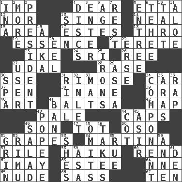 ACROSS 1. Mischievous child 4. Letter starter 8. Singer James 12. Or not 13. Scorch 14. Be tempered by heat 15. Type of rug 17. _____ Park, CO 18. Through, poetically 19. Gist 21. Cylindrical with tapered ends 23. Eisenhower's nickname 24. _ Lanka 26. To sift 27. Allodial 28. Raze (variant) 30. Compass dir. 31. Full of chinks, cracks, or crevices 34. Auto 37. Writing instrument 38. Silly 39. Mouth or opening 40. Tate display 41. Greek mezzo-soprano Agnes 42. Atlas unit 43. Diluted with white 44. Smile enhancers 46. Male offspring 47. Small child 50. Bear (Spanish) 51. Wine fruits 54. Chrissie's court nemesis 57. Cause heat under the collar 58. Japanese poetic form 60. Tear apart 62. "If ____ say so..." 63. First name in cosmetics 64. Compass dir. 65. Unadorned 66. Backtalk 67. "___ Little Indians" DOWN 1. _ tizzy (2 wds.) 2. Greater amount 3. Elected leader of a country 4. Plates 5. Keyboard key 6. Personal question 7. Remainder 8. Main course 9. Giggle 10. Small pie 11. _ vera 13. Elected rep. 16. "____ silly question..." 20. Snakelike fish 22. Celtic language 25. Removes the wrinkles 27. One who uses or employs something 29. At sea 30. Health resort 31. Monetary unit of Yemen 32. An arm off of a larger body of water 33. Floor protector 34. Part 35. Caspian sea tributary 36. Strike 41. Object of repulsion 43. Wimpy's pal 44. Small bed 45. SW Saudi Arabia district 46. Vegetable dish 48. Leaves out 49. Receives possession of 51. Amused look 52. Tall New Zealand timber tree 53. "______ My Girl" (Turtles hit) 55. Sorrow 56. Singer Murray 59. White ___ sheet 61. Lair