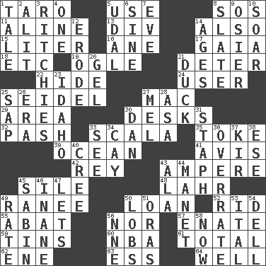 ACROSS 1. Pacific island yam 5. Purpose 8. Distress signal 11. Place in a line 13. HTML Container Element 14. In addition 15. 61 cubic inches 16. One (Scot) 17. Greek goddess of the earth (variant) 18. And so on (abbr.) 19. Stare at amorously 21. Prevent from occurring 22. Flintstone garb 24. One who makes use of a thing 25. Beer mug 27. Apple computer (short form) 29. Length times width 30. Writing tables 32. Romantic infatuation 33. Any of the three canals of the cochlea 35. Casino tip 39. Sea 41. Advice 42. Marina Del _, California 43. Electrical Unit 45. Filth; sediment 48. Cowardly lion portrayer 49. Indian princess (variant) 50. Grant temporary use of 52. To free from 55. Blind as ____ 56. And not 57. Related on the mother's side 59. Metal containers 60. Basketball assoc. 61. "_____ Recall" 62. Compass dir. 63. Double-curved letter 64. Water source DOWN 1. Story 2. Came down and settled, as after flight 3. Actors Guy, Robert Welles, and Clint 4. Single 5. Hereditary estate 6. Trig term 7. Night before a holiday 8. Chalkboard 9. Flexible twig of a willow tree 10. Fly high 12. Wear away 14. Eons 20. Set 21. Evade 23. Potato state 25. Plant excrement 26. Period 27. Cartoonist voice _ Blanc 28. White ___ sheet 30. Daniel's nick name 31. Staphylococcus 33. Observe 34. Island 36. Make much ado about nothing 37. Apertif with cassis 38. Compass dir. 40. Algonquian 43. Chicken ___ king 44. French painter Edouard 45. Unit of acoustic absorption 46. Lacking in sense or substance 47. Allows 49. Assign a rank or rating to 50. Tennis shots 51. Mouths or openings 53. Slanted text style (abbr.) 54. Small valley 56. Compass dir. 58. Immediately