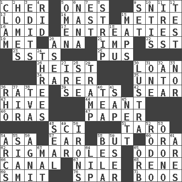 ACROSS 1. "Mermaids" star 5. Washington bills 9. In a ____ (agitated or irritated) 13. Farming town in central California 14. Vertical spar for supporting sails 15. Distance measurement (Brit.) 16. Among 17. Pleas 19. Was introduced to 20. Santa ___, CA 21. Naughty child 22. Fast jet (abbr.) 23. Fast planes 25. Tenth month of the Hindu calendar 26. Robbery 30. Grant temporary use of 34. More valued for its uncommonness 35. To (old English) 36. Assign a rank or rating to 39. Theater features 42. Shrivel 43. Hub of activity 44. Intended 46. Mouths or openings 47. Some stationery 48. _-fi 51. Pacific island yam 54. White ___ sheet 57. Ewer handle 58. With the exception that 60. Mouth or opening 62. Complicated, petty procedures 65. Scent 66. Lessep's creation 67. Mediterranean tributary 68. French philosopher Descartes 69. Stricken, poetically 70. Practice fight 71. Scornful sounds DOWN 1. Dollar (slang) 2. Dwellings 3. Proofreads 4. To free from 5. Sign of things to come 6. Grandmother 7. Eastern Standard Time (abbr.) 8. Long narrow piece of something 9. Arrange properly for use 10. Nuclear Threat Initiatives 11. Angers 12. Trial 15. Atlas contents 18. Australian flightless bird 20. Toward the sea 24. Triplets 27. Big collection agency 28. Perceive with the eye 29. _____ steamer (cargo ship) 30. A period of five years 31. Single 32. _ moment's notice (2 wds.) 33. Or not 36. 17th letter of the Greek alphabet 37. Atmosphere 38. Federal power corp. 40. Beverage made from leaves 41. Plant excrement 45. Remaining after all deductions 48. Lick closed 49. 4-wheeled motor vehicle 50. Removes the wrinkles 52. Cowboy competition 53. U. of Maine site 54. Arches 55. Thailand, formerly 56. Hindu god of fire 58. Actor Lugosi 59. One who uses or employs something 61. Ancient Greek god of war 63. Floor covering 64. Mouth edge 65. Globe