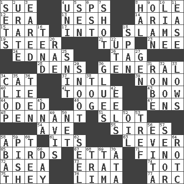 ACROSS 1. Take to court 4. United States Postal Service (abbr.) 8. Opening into or through something 12. Period 13. Tender 14. Operatic vocal solo 15. Small pie 17. To the inside or interior of 18. Criticizes harshly 19. Navigate 21. Uncastrated adult male sheep 23. Born 24. Ferber et al. 26. Label 28. Lairs 30. Commissioned military rank 34. Domesticated feline 37. International (abbr.) 39. Words to Nanette 40. Untruth 41. Woman's close-fitting hat 43. Ribbon knot 44. Wrote a lyric poem 46. Double curve, resembling the letter S 47. Followers of ems 48. Pre-World Series prize 51. Groove 54. "___ Maria" 55. Founders of families 58. Fitting 61. It is 63. Prying instrument 65. Avian creatures 67. Singer James 71. Fine (Spanish) 72. Toward the sea 73. Part of Q.E.F. 74. Small child 75. Those people 76. Pale green bean 77. Curve DOWN 1. Puts into a specified state 2. A salt of uric acid 3. Having ears or earlike features 4. Corn or form start 5. Elected rep. 6. Pacific Standard Time (abbr.) 7. Went for two points 8. Actor Linden 9. NW Algerian seaport 10. Welles in "The Third Man" 11. Relaxation 16. Be inclined (to) 18. Connect, as a bridge 20. Actress Charlotte 22. Shoshoni 25. In a ____ (agitated or irritated) 27. Commissioned mil. rank 29. Snob 30. Cements 31. Loose flowing garment 32. Soon (poet.) 33. Coldest temperatures 34. Hoof sound 35. Assistant 36. Adolescent 38. Coat; cloak 42. Snakelike fish 45. Heredity factor (abbr.) 49. Advice 50. Fish or hair follower 52. Lubricate 53. Not kosher 56. Webber/Rice musical 57. Sir (Sp.) 58. Blind as ____ 59. Expression of disdain 60. Woody plant 62. Stitch closed the eyes of (a falcon) 64. College mil. group 66. 24 hours 68. Three (prefix) 69. Scottish cap 70. _ moment's notice (2 wds.)