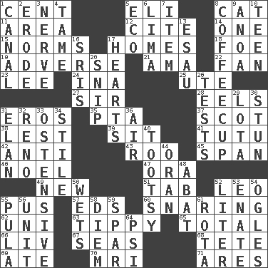 ACROSS 1. Penny 5. Connecticut Ivy Leaguer 8. Feline 11. Length times width 12. Quote 14. Single 15. Typical standards 17. Residences 18. Enemy 19. Contrary to your interests or welfare 21. Housemaid (var.) 22. Air blower 23. Area sheltered from the wind 24. _ tizzy (2 wds.) 25. Shoshoni 27. Title for a knight 28. Snakelike fish 31. Greek god of love 35. Parent Teacher Assoc. 37. Highlander 38. For fear that 39. Be seated 41. Ballerina skirt 42. Opposed to 43. Friend of Pooh 45. Connect, as a bridge 46. Christmas carol 47. Mouth or opening 49. ___ Haven, CT 51. Bar bill 52. Lion 55. Ichor 57. Begley and Asner 60. Catching in a trap 62. Single; one (prefix) 63. Likely to tip or tilt 65. Add up to 66. 54 in ancient Rome 67. Oceans 68. False hair 69. Had dinner 70. Medical imaging device (abbr.) 71. Ancient Greek god of war DOWN 1. Lessep's creation 2. Wear away 3. Effrontery 4. Not wild 5. Environmental prefix 6. Pale green bean 7. Detail 8. Java holder (2 wds.) 9. Small Philippine buffalo 10. Adolescent 13. Son of Isaac 16. Indian titles of respect 17. Centers of feelings and intuitions 20. Sever or remove by pinching or nipping 26. Trials 29. Globular water bottle used in Asia 30. Surprise greatly 31. Style 32. Former U.S. Attorney General Janet 33. Clearly or manifestly demonstrative 34. Vertical member of a panel or frame 36. Wind 40. Tootsie (variant) 44. NW Algerian seaport 48. Blind as ____ 50. Soaks 52. 61 cubic inches 53. Related on the mother's side 54. Stares 55. Monetary unit of Botswana 56. A single undivided whole 58. South Vietnam president (1954) 59. Practice fight 61. Roll call or roster of names 64. Air pressure measure (abbr.)