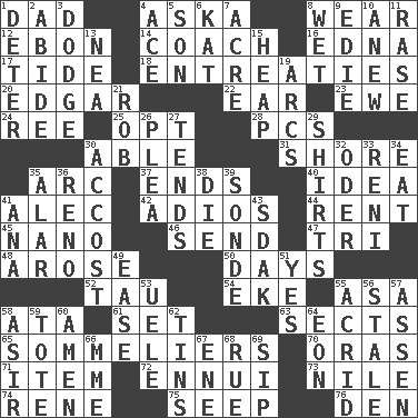 ACROSS 1. Male parent 4. "____ silly question..." 8. Put on (as clothing) 12. Inky black, to poets 14. Team commander 16. Pulitzer Prize-winning author Ferber 17. Event that recurs at intervals 18. Pleas 20. _ Allan Poe 22. Hearing organ 23. She-sheep 24. To sift 25. Choose 28. Personal Computers (abbr.) 30. Competent 31. Dinah or Pauly 35. Curve 37. Conclusions 40. It may be bright or harebrained 41. Actor Baldwin 42. Goodbye (Sp.) 44. Monthly bill 45. Billionth: prefix 46. Transmit 47. Three (prefix) 48. Came up 50. 24-hour periods 52. The 19th letter of the Greek alphabet 54. Supplement with great effort 55. White ___ sheet 58. "One Day ___ Time" 61. Arrange properly for use 63. Religious groups 65. Wine waiters 70. Mouths or openings 71. Detail 72. World-weariness 73. The longest river in the world 74. French philosopher Descartes 75. Ooze 76. Lair DOWN 1. Prevent from occurring 2. Tolerate 3. Evade 4. Adept person 5. Male child 6. Krazy ___ of comics 7. 43,560 square feet 8. Soggy 9. Singer Brickell 10. Afresh 11. To erase 13. Teachers' org. 15. Pile 19. Curves 21. Director Reiner 26. Entreaty 27. Watches over 29. Chest coverings 30. Buttonhole 32. River in Europe 33. Painter Guido (1575-1642) 34. Erode 35. Having or resembling wings 36. Former U.S. Attorney General Janet 38. Pass on 39. Something which is sent 41. Santa ___, CA 43. Neighbor of Neb. 49. Relaxation 51. Affirmative reply 53. Ubangi River tributary 55. Bitter 56. Lacking originality or spontaneity 57. NE Netherlands city 58. SW Saudi Arabia district 59. Haul 60. So be it 62. Metal containers 64. Age 66. Madame (abbr.) 67. Compass dir. 68. Sorrow 69. Small drink