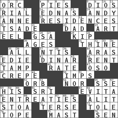 ACROSS 1. The grampus (Milton) 4. Sliced desserts 8. "Vaya con ____" 12. Monetary unit of Yemen 14. Ferber et al. 16. Actor Griffith 17. Queen of England 1702-14 18. Dwellings 20. Sadhe (variant) 22. Male parent 23. Tate display 24. Snakelike fish 25. Girls' org. (abbr.) 28. Monetary unit of Laos 30. Eras 31. One or ones belonging to thee 35. Everything 37. Nuclear Threat Initiatives 40. Caspian sea tributary 41. Singer Brickell 42. Middle Eastern gold or silver currency 44. Monthly bill 45. Pack (down) 46. Pace 47. Bear (Spanish) 48. Streamer paper 50. Naughty children 52. Globe 54. Not either 55. Compass dir. 58. Part of HMS, perhaps 61. _ Lanka 63. Webber/Rice musical 65. Pleas 70. Came down and settled, as after flight 71. Portico 72. Laconic 73. Lacquered or enameled metalware 74. Drink excessively 75. Vertical spar for supporting sails 76. Elected rep. DOWN 1. Declaim 2. Remove soap 3. Lessep's creation 4. For each 5. Binary compound 6. Followers of ems 7. Stated 8. One of the 12 tribes of Israel 9. South American Indian 10. Baltic tributary 11. System (abbr.) 13. Directed 15. Neighbor of Neb. 19. Prepare for publication 21. Oval reproductive body of a fowl 26. Transmit 27. Having gotten out of bed 29. N Egypt peninsula 30. City in Syria 32. Angers 33. Billionth: prefix 34. Eastern Standard Time (abbr.) 35. The sixth month of the Jewish calendar 36. Welles in "The Third Man" 38. _ tizzy (2 wds.) 39. Smooth fabric 41. And so on (abbr.) 43. San ____ (Riviera town) 49. Celtic language 51. Before (prefix) 53. Naughty child 55. Grain storage towers 56. Vertical member of a panel or frame 57. Ingested 58. Behest 59. To the inside or interior of 60. Discontinue 62. Detail 64. Large container 66. Actress Charlotte 67. Lyricist Gershwin 68. Double-curved letter 69. Arrange properly for use