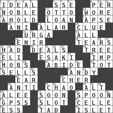 ACROSS 1. Perfect 6. Compass dir. 9. For each 12. Impressive in appearance 13. "Beetle Bailey" pooch 14. Had on 15. Hold, grip (Informal) 16. Grant temporary use of 17. Domed church section 18. Black tropical American cuckoo 19. Having or resembling wings 20. A slight indication 21. Capital and largest city of Mongolia 23. Everything 24. Independent ruler or chieftain 25. Pulls into pieces 28. Possessed 30. Allots cards 34. Family _ (genealogy) 35. Connecticut Ivy Leaguer 36. 1973 Nobel Price Winner (Physics) Leo 38. Mischievous child 39. Disorderly crowds 41. Stay 43. Small child 44. Exchanges for money 46. "60 Minutes" Commentator Rooney 48. Hearing organ 49. "Mermaids" star 50. Against 51. US Secretary of Labor Elaine L. _ 53. Keyboard modifier key 56. Toward shelter 57. Within a short period 58. Soup utensil 60. Global Positioning Systems (abbr.) 61. Position in a hierarchy or organization 62. Cell (Danish) 63. Curvy letter 64. Small boy 65. Small island DOWN 1. _ tizzy (2 wds.) 2. Capital of the state of Qatar 3. Inky black, to poets 4. Plant genus of onion and garlic 5. Directed 6. Portico 7. Play the lead 8. A really long time 9. Teen's desire 10. Celtic language 11. To separate or throw off 13. Spanish pot 14. Place for singles 19. Match 20. Feline 22. To free from 24. The property of being fit to eat 26. San ____ (Riviera town) 27. Back-to-school mo. 28. Equivocates 29. _ vera 31. White ___ sheet 32. Experiment locale 33. What Jean-Claude Killy likes to do 37. Potato state 40. Chalkboards 42. Compass dir. 45. _ Lanka 47. Window treatments 49. Patter 50. High mountains 51. Root beer relative 52. Parka part 54. Hang loosely or laxly 55. Lacquered or enameled metalware 56. Personal question 57. Fast jet (abbr.) 58. _-fi 59. Fish or hair follower