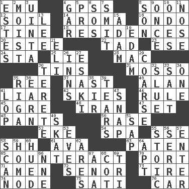 ACROSS 1. Australian flightless bird 4. Global Positioning Systems (abbr.) 8. Within a short period 12. Earth 14. Odor 16. Southwest Nigerian state 17. Prong on a fork 18. Dwellings 20. First name in cosmetics 22. Small boy 23. Compass dir. 24. R.R. building 25. Untruth 28. Apple computer (short form) 30. Airtight sealed metal containers 31. With motion or animation 35. To sift 37. Political cartoonist Thomas 40. Actor Alda or Thicke 41. One who doesn't tell the truth 42. Atmospheres 44. Governing power 45. Legendary monster 46. SW Asia republic 47. Put into a specified state 48. Leg coverings 50. To erase 52. Supplement with great effort 54. Health resort 55. Compass dir. 58. Quiet! 61. Actress Gardner 63. Eucharist need 65. Frustrate 70. Left side of a ship or aircraft 71. So be it 72. Sir (Sp.) 73. Hoop that covers a wheel 74. Connecting point 75. Suttee (variant) 76. Auto DOWN 1. _____ Park, CO 2. Wet 3. National forest in Provo, Utah 4. Slender fish 5. Before (prefix) 6. Distress signal 7. Stricken, poetically 8. Boy, to dad 9. At one time in the past 10. Lyric poems 11. Olfactory organ 13. Area sheltered from the wind 15. First man 19. Dutch treat 21. Biblical high priest 26. Lodging establishments 27. 1973 Nobel Price Winner (Physics) Leo 29. Unrefined 30. Cigar-shaped 32. Change direction abruptly 33. Table seasoning 34. Single 35. Capital of Latvia 36. Merit 38. Title for a knight 39. Rends 41. Chop off 43. Fastener 49. Three-handed card game 51. Plant excrement 53. Nights before holidays 55. Unemotional 56. Father Junipero _ 57. Keyboard key 58. Examine minutely or intensely 59. Same (prefix) 60. Became colored 62. Ancient Greek god of war 64. Fitting 66. Compass dir. 67. Santa ___, CA 68. Small bed 69. Three (prefix)