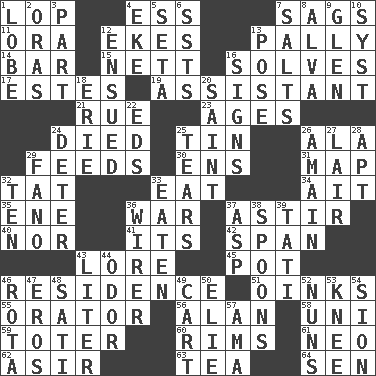 ACROSS 1. Chop off 4. Curvy letter 7. Droops 11. Mouth or opening 12. Makes supply last 13. Friendly 14. Tavern 15. Remaining after all deductions 16. Finds the solution 17. _____ Park, CO 19. Aide 21. Regret 23. Eons 24. Passed on 25. Metal container 26. According to 29. Eats 30. Followers of ems 31. Atlas unit 32. Make lace 33. Ingest 34. Small island 35. Compass dir. 36. Armed conflict 37. Moving or stirring 40. And not 41. ___ a Wonderful Life 42. Connect, as a bridge 43. Old wives' tales, e.g. 45. Cooking vessel 46. Home 51. Pig sounds 55. Speaker 56. Actor Alda or Thicke 58. University (slang) 59. Carrier 60. Basketball hoops 61. Modern: prefix 62. SW Saudi Arabia district 63. Afternoon social gathering 64. Elected rep. DOWN 1. Ear part 2. Mouths or openings 3. Role in a play 4. Supplement with great effort 5. Stalk of a moss capsule 6. Fast planes 7. Table seasonings 8. Inventor's middle name 9. Small, secluded valley 10. System (abbr.) 12. Followed as a consequence or result 13. Introduce or present, as a question 16. Signals 18. One of the Great Lakes 20. Inhabitant of Heaven 22. Begley and Asner 24. Prevent from occurring 25. Pulls apart 26. With great haste 27. Den 28. Fitting 29. Papal veil 32. "___ Little Indians" 33. Consumed 36. One who wires 37. Viper 38. Soup utensils 39. Jacques of French films 43. 61 cubic inches 44. Scent 46. Round or rotation of duties 47. Greek god of love 48. Suttee (variant) 49. Haul 50. Writer Wiesel 52. Religious women 53. Leg joint 54. The Jewish people; Israel 57. Nursemaid (var.)