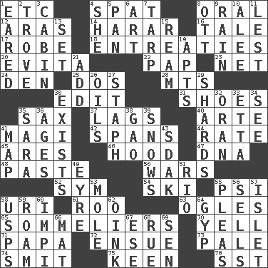 ACROSS 1. And so on (abbr.) 4. Petty quarrel 8. Spoken 12. Ancient river in northeast Turkey 14. Ethiopian city, capital of Harari 16. Lie 17. Loose flowing garment 18. Pleas 20. Webber/Rice musical 22. Infant food 23. Fish or hair follower 24. Lair 25. Two (Sp.) 28. Mountains (abbr.) 30. Prepare for publication 31. Imelda's hoard 35. Saxophone 37. Fails to keep up a pace 40. Johnson of "Laugh-In" 41. Wise men 42. Connects, as a bridge 44. Pace 45. Ancient Greek god of war 46. Parka part 47. Heredity factor (abbr.) 48. Thick mixture 50. Armed conflicts 52. Symbol (abbr.) 54. What Jean-Claude Killy likes to do 55. Air pressure measure (abbr.) 58. RI univ. 61. Friend of Pooh 63. Stares 65. Wine waiters 70. Shout 71. Dad 72. Take place subsequently 73. Light colored 74. Stricken, poetically 75. Peachy ____! 76. Fast jet (abbr.) DOWN 1. Having ears or earlike features 2. Collection of objects 3. Apartment or room in a ship 4. A female animal or person 5. Baking dish 6. Nonscientific branch of learning 7. Canvas cover 8. Baseball player Mel 9. Precipitation 10. Toward shelter 11. For fear that 13. Put into a specified state 15. 480, 500 or 516 sheets of paper 19. Tenement units (abbr.) 21. Increase 26. Petroleums 27. Staphylococcus 29. Pottery fragments 30. Has an existence 32. NW Algerian seaport 33. Singer James 34. Observe 35. "Two Mules for Sister ____" 36. Eons 38. E Mali city 39. Overwhelms 41. Atlas unit 43. Neighbor of Neb. 49. Jane of fiction 51. River (Sp.) 53. Undercover agent 55. Entreaties 56. Makes a sale 57. Small island 58. United States Postal Service (abbr.) 59. Wander 60. Body of Kaffir warriors 62. Pig sound 64. Hustle 66. Floor covering 67. Compass dir. 68. Regret 69. Elected rep.