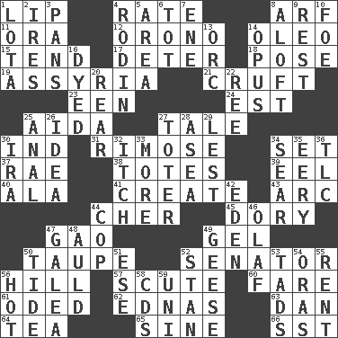 ACROSS 1. Mouth edge 4. Pace 8. Sandy's bark 11. Mouth or opening 12. U. of Maine site 14. Margarine 15. Be inclined (to) 17. Prevent from occurring 18. Introduce or present, as a question 19. Nineveh was its capital 21. An unpleasant substance 23. Car or cant ending 24. Eastern Standard Time (abbr.) 25. Opera by Verdi 27. Lie 30. Working for oneself (abbr.) 31. Full of chinks, cracks, or crevices 34. Arrange properly for use 37. Actress Charlotte 38. Lugs 39. Snakelike fish 40. In the manner of 41. Cause to be 43. Curve 44. "Mermaids" star 45. Dinghy 47. E Mali city 49. Set 50. Grayish beige 52. Elected representative 56. Land elevation 57. Snake scale 60. Conductor's collection 61. Wrote a lyric poem 62. Ferber et al. 63. Daniel's nick name 64. Beverage made from leaves 65. Trig term 66. Fast jet (abbr.) DOWN 1. Globular water bottle used in Asia 2. Angers 3. Baking dishes 4. "The Thinker" sculptor 5. Type of rug 6. Small child 7. Compass dir. 8. High up in or into the air 9. Take ten 10. Enemy 13. The grampus (Milton) 14. Musical composition 16. Colored 20. Hitchcock's "____ Window" 22. To sift 25. Of or related to the anus 26. The main thing one is thinking about 27. Carrier 28. At sea 29. For fear that 30. Retirement account (abbr.) 32. Hankering 33. Greater amount 34. Burn superficially 35. Suggestive of the supernatural 36. Affectionate concern, for short 42. Paradise 44. Police officer (slang) 46. Norwegian king 47. An organ shaped like a helmet 48. Old (Scot.) 49. Honkers 50. Event that recurs at intervals 51. Compass dir. 52. Comedian Laurel of Laurel & Hardy 53. Small boys 54. Mouths or openings 55. Monthly bill 56. Being at a high temperature 58. Music discs 59. University (slang)