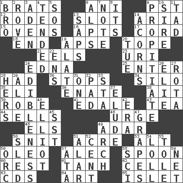 ACROSS 1. Naughty children 6. Black tropical American cuckoo 9. Pacific Standard Time (abbr.) 12. Cowboy competition 13. Slit 14. Roberta Peters solo 15. Baking chambers 16. Tenement units (abbr.) 17. Drawstring 18. Conclude 19. Domed church section 20. Drink excessively 21. Snakelike fish 23. RI univ. 24. Pulitzer Prize-winning author Ferber 25. Keyboard key 28. Possessed 30. Discontinues 34. Grain storage tower 35. Connecticut Ivy Leaguer 36. Related on the mother's side 38. Small island 39. Loose flowing garment 41. Peak District village in England 43. Afternoon social gathering 44. Exchanges for money 46. Goad 48. Raised railways 49. The sixth month of the Jewish calendar 50. In a ____ (agitated or irritated) 51. Land measure 53. The first octave above the treble staff 56. Butter sub 57. Actor Baldwin 58. Soup utensil 60. Remainder 61. Hyperbolic tangent 62. Cell (Danish) 63. Music discs 64. Tate display 65. Small island DOWN 1. Sis' sibling 2. Be footloose 3. An important port of Yemen 4. Looked after 5. Distress signal 6. High mountains 7. Musical sound 8. It is 9. Conciliate 10. Beget 11. Bit 13. Plant excrements 14. Oak nuts 19. Having winglike extensions 20. Third day of the wk. 22. Followers of ems 24. The property of being fit to eat 26. Writer Wiesel 27. Round or rotation of duties 28. Possessive pronoun 29. _ vera 31. Single 32. Groovy apt. 33. R.R. building 37. Evade 40. American author Paul (1891-1958) 42. Epoch 45. Fast jet (abbr.) 47. Wine fruits 49. Bowlike part 50. Downhill vehicle 51. Having or resembling wings 52. Penny 54. Hang loosely or laxly 55. Lacquered or enameled metalware 56. The grampus (Milton) 57. _ moment's notice (2 wds.) 58. _-fi 59. Fish or hair follower