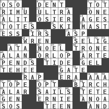 ACROSS 1. Bear (Spanish) 4. Incision 8. Small child 11. Tall New Zealand timber tree 13. Extreme 15. Single 16. Came down and settled, as after flight 17. Flexible twig of a willow tree 18. Matures 19. Hauls 21. What Jean-Claude Killy likes to do 22. Vertical spar for supporting sails 23. Double-curved letter 24. Big collection agency 27. Viper 29. Songbird 30. Major League Baseball Commissioner Bud 34. "One Day ___ Time" 36. Christmas carol 39. Heavy duty weighing machine 40. ____ Jay Lerner 41. Fourth or lowest deck 43. Johnson of "Laugh-In" 44. Hangs 46. Periodic rise and fall of the sea level 47. Set 48. Giggle 49. Yard entry 51. Hit sharply and swiftly 53. Epoch 54. American Automobile Association (abbr.) 57. Drink excessively 60. Elect 63. A tree used for making furniture 65. Having or resembling wings 66. Moves on water 69. False hair 70. Commissioned military rank (abbr.) 71. Bert's buddy 72. Small Philippine buffalo 73. Mayday 74. Adolescent 75. Plus DOWN 1. Declaim 2. Grain storage towers 3. Leaves out 4. Superhero pair 5. Raised railways 6. Nuclear Threat Initiatives 7. Long journey 8. Ancient Roman robe 9. Washington bills 10. Trial 12. Shoshoni 14. Roberta Peters solo 18. Electrical Measurement 20. Title for a knight 25. Western Nevada city 26. Derisive sound 28. Fast jet (abbr.) 29. Roamer 31. Old wives' tales, e.g. 32. International (abbr.) 33. Turn to the right 34. Toward shelter 35. Hyperbolic tangent 37. Biblical high priest 38. Inn 40. Fitting 42. Lightbulb-shaped fruit 45. Ocean 50. Keyboard key 52. Airs 54. Sports stadium 55. NE Massachussets city 56. Toward the future 57. Labels 58. Margarine 59. Zero-star reviews 61. Piece 62. Prong on a fork 64. Call ___ day 67. Falsehood 68. Elected rep.