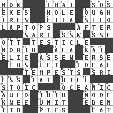 ACROSS 1. At this time 4. Not this but _ 8. Distress signal 11. Makes supply last 13. Hollow 14. Ending for "Through" and "Enough" 15. Angers 16. Singer James 17. Grain storage tower 18. Portable computers 21. Following 22. Indian skirt 23. Compass dir. 25. Compass dir. 26. Baseball player Mel 29. A testis 32. Compass direction 34. In the manner of 35. Krazy ___ of comics 38. Writer Wiesel 39. NE Netherlands city 41. Celtic language 43. Greek goddess of the dawn 44. Allow 45. Perfect 46. Storms 50. _ Lanka 51. Double-curved letter 54. Make lace 55. Land elevation 57. Unemotional 59. Pertaining to the sea 63. Old (Scot.) 64. Ballerina skirt 67. Method 68. Leg joint 69. A single undivided whole 70. Genesis locale 71. It would 72. Sliced desserts 73. Ingest DOWN 1. Famous astronaut Armstrong 2. Gumbo ingredient 3. Shed a tear 4. College paper 5. Being at a high temperature 6. Keyboard modifier key 7. Beverage made from leaves 8. Sets of matching outer garments 9. Stares at amorously 10. Dinah or Pauly 12. Fast planes 14. Order of Saint Francis (abbr.) 19. Pledge 20. Before (prefix) 21. Leather borer 23. Filth; sediment 24. Glance over 26. Single 27. Lacquered or enameled metalware 28. Musical group of three 30. Clothes sense 31. Made supply last 33. Trial 36. Ancient Greek god of war 37. Russian ruler of old 39. _ mater 40. Back-to-school mo. 42. Biblical high priest 45. Capri or Wright 47. And so on (abbr.) 48. Yells 49. Nervous spasm 51. 1973 Nobel Price Winner (Physics) Leo 52. Check the growth or development of 53. Having a sole or soles 56. Unable to walk 58. Binary compound 60. Connecting point 61. The content of cognition 62. Penny 64. Uncastrated adult male sheep 65. Corn or form start 66. Make a knot
