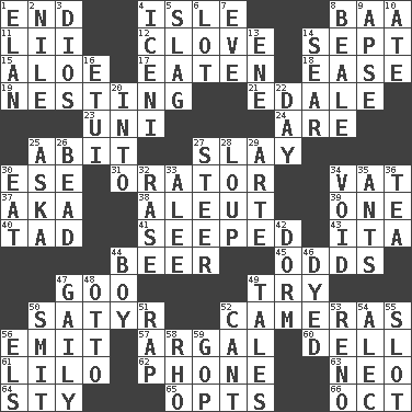 ACROSS 1. Conclude 4. Small island 8. Sound made by sheep 11. Cards in a Roman deck? 12. Garlic unit 14. Back-to-school mo. 15. Medicinal plant 17. Eroded 18. Relaxation 19. Inhabiting a nest 21. Peak District village in England 23. Single; one (prefix) 24. "We ___ not amused" (Victoria) 25. "This won't hurt ____!" 27. Kill 30. Compass dir. 31. Speaker 34. Large container 37. Alias (abbr.) 38. Eskimo relative 39. Single 40. Small boy 41. Oozed 43. Call ___ day 44. Fermented drink made from hops 45. Likelihood 47. Thick or sticky substance 49. Attempt 50. Letch 52. Devices for capturing images 56. Send forth 57. Therefore, facetiously 60. Small valley 61. _ and Stitch 62. Give a jingle 63. Modern: prefix 64. Filthy place 65. Elects 66. Sep. follower DOWN 1. Style 2. "Death on the ____" 3. "Vaya con ____" 4. Ancient Celtic tribe of eastern Britain 5. Volcanic refuse 6. Car dealer's back yard 7. Night before a holiday 8. Calif. Air Force Base 9. Domed church section 10. Had dinner 13. Compass dir. 14. Dry up 16. Needle holder 20. To the inside or interior of 22. 24 hours 25. "____ silly question..." 26. Necklace unit 27. Bull 28. Central Nebraska county 29. Johnson of "Laugh-In" 30. Ingest 32. Raze (variant) 33. Toward shelter 34. Empty area or space 35. Pismires 36. Beverage made from leaves 42. Dormintory (informal) 44. Male child 46. Colored 47. Lightheartedly 48. "Beetle Bailey" pooch 49. Falsehoods 50. Stricken, poetically 51. Hit sharply and swiftly 52. Patter 53. Former U.S. Attorney General Janet 54. Actor Baldwin 55. Narrow opening 56. Raised railways 58. 17th letter of the Greek alphabet 59. Republican Party