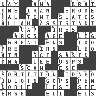 ACROSS 1. 24 hours 4. Santa ___, CA 7. Naughty child 11. Single 12. SW Asia republic 13. Eat (away) 14. Actor Linden 15. Portable shelter 16. Chalkboards 17. Assad's deity 19. Aide 21. Head covering 23. Angers 24. Curves 25. Ripen 26. Part of a journey 29. Relatively large 30. Followers of ems 31. Wedding promise 32. Before (prefix) 33. Big collection agency 34. Lion 35. The 18th letter of the Arabic alphabet 36. _-fi 37. Indian antelope 40. Heredity factor (abbr.) 41. Area sheltered from the wind 42. United States Postal Service (abbr.) 43. Examine minutely or intensely 45. Compass dir. 46. Decision 51. Potato state 55. Foolish or stupid persons 56. Republicans 58. Fenced enclosure 59. Impressive in appearance 60. For fear that 61. Perceive with the eye 62. Celtic language 63. Biblical high priest 64. Raised railways DOWN 1. Capital of the state of Qatar 2. Of or related to the anus 3. Shout 4. "We ___ not amused" (Victoria) 5. Grandmother 6. Pismires 7. Naughty children 8. Round or rotation of duties 9. An important port of Yemen 10. Trial 12. New York city 13. Otherwise 16. Titles for men of rank and authority 18. Land measure 20. Signals 22. Pacific Standard Time (abbr.) 24. Sports stadium 25. Nest on high 26. Ms. Damita and namesakes 27. Genesis locale 28. Thick or sticky substance 29. Amused look 32. Writing tablet 33. Ancient Celtic tribe of eastern Britain 36. Narrow boards 37. Institute legal proceedings 38. Help 39. Broke a traffic law 43. Took without asking 44. Quote 46. Trig term 47. Aroma 48. Chest bones 49. Stare 50. Christmas carol 52. Domed church section 53. Person who is morally reprehensible 54. Singles 57. 23rd letter of the Greek alphabet
