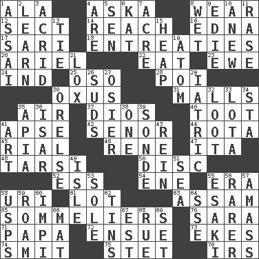 ACROSS 1. Chicken ___ king 4. "____ silly question..." 8. Erode 12. Religious group 14. Arrive at 16. Pulitzer Prize-winning author Ferber 17. Indian skirt 18. Pleas 20. Satellite of Uranus 22. Ingest 23. She-sheep 24. Indiana (abbr.) 25. Bear (Spanish) 28. Luau course 30. Amu Darya 31. Promenades 35. Atmosphere 37. "Vaya con ____" 40. A blast of a horn 41. Domed church section 42. Sir (Sp.) 44. Round or rotation of duties 45. Monetary unit of Yemen 46. French philosopher Descartes 47. Call ___ day 48. Tarsus (plural) 50. Compact _ 52. Curvy letter 54. Compass dir. 55. Epoch 58. RI univ. 61. Car dealer's back yard 63. Indian state 65. Wine waiters 70. "Two Mules for Sister ____" 71. Dad 72. Follow as a consequence or result 73. Makes supply last 74. Stricken, poetically 75. Proofreading order 76. Big collection agency DOWN 1. Slender Brazilian palm 2. Memorize 3. Bitter 4. "We ___ not amused" (Victoria) 5. Elected rep. 6. Krazy ___ of comics 7. 1/640 square mile 8. Dripping 9. Singer Brickell 10. Afresh 11. To erase 13. Make a knot 15. Pile 19. Tiny particle 21. Brine-cured salmon 26. Soap bubbles 27. Flexible twig of a willow tree 29. Of or pertaining to medicine 30. Threatening words 32. Spoils 33. Globular water bottle used in Asia 34. R.R. building 35. Capital of Western Samoa 36. Austrian river, tributary to the Danube 38. Single 39. Message 41. Tate display 43. It's straight from the horse's mouth 49. Small island 51. Ocean 53. Flatfish 55. 1973 Nobel Price Winner (Physics) Leo 56. More valued for its uncommonness 57. Collect or gather 58. United States Postal Service (abbr.) 59. Wander 60. Body of Kaffir warriors 62. Metal containers 64. Compass dir. 66. Floor covering 67. Eastern Standard Time (abbr.) 68. Sorrow 69. Put into a specified state