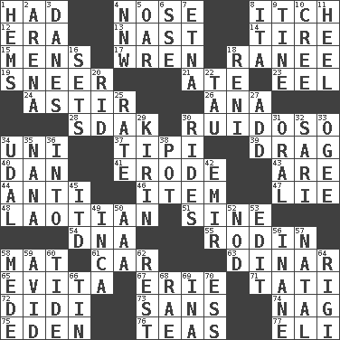 ACROSS 1. Possessed 4. Characteristic smell of wine 8. Hankering 12. Epoch 13. Political cartoonist Thomas 14. Become fatigued 15. Not women's 17. Songbird 18. The wife of a rajah (variant) 19. Contemptuous expression 21. Had dinner 23. Snakelike fish 24. Having gotten out of bed 26. Santa ___, CA 28. Neighbor of Neb. 30. Noisy, rowdy, vocal (Spanish) 34. University (slang) 37. Native american tent (variation) 39. To draw with force 40. Daniel's nick name 41. Wear away 43. "We ___ not amused" (Victoria) 44. Opposed to 46. A distinct part 47. Falsehood 48. Of or relating to Laos or its people 51. Trig term 54. Heredity factor (abbr.) 55. "The Thinker" sculptor 58. Floor covering 61. Auto 63. Middle Eastern gold or silver currency 65. Webber/Rice musical 67. 4th largest of the Great Lakes 71. Jacques of French films 72. "You Light Up My Life" star Conn 73. Without 74. Tired old horse 75. Paradise 76. Beverages made from leaves 77. Biblical high priest DOWN 1. Cloth borders 2. Sports stadium 3. Natives or inhabitants of Denmark 4. Compass dir. 5. Rowing implement 6. Compass dir. 7. Inactive volcano in Sicily 8. Call ___ day 9. Prong on a fork 10. Algonquian 11. The bottom of a shoe or boot 16. Arranges properly for use 18. Painter Guido (1575-1642) 20. To free from 22. The 19th letter of the Greek alphabet 25. Assign a rank or rating to 27. Say or write further 29. Japanese brewing company 30. Amusement-park features 31. Taken by mouth 32. Indian skirt 33. Double curve, resembling the letter S 34. Hereditary estate 35. Grandmother 36. To the inside or interior of 38. Plant holder 42. Arab leader 45. It would 49. South American Indian 50. American Automobile Association (abbr.) 52. Allow head to fall sleepily 53. Prepare for publication 56. Silly 57. Relating to or accompanying birth 58. Ancient Persian 59. Enthusiastic 60. Event that recurs at intervals 62. Repose 64. Swiss mountan, "Queen of the Mountains" 66. Shallow baking pan 68. Actress Charlotte 69. _ tizzy (2 wds.) 70. Curvy letter