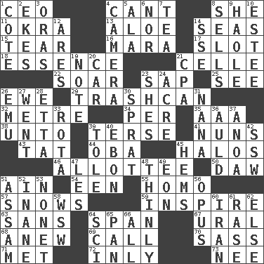 ACROSS 1. Corporate head (abbr.) 4. Patter 8. A female animal or person 11. Gumbo ingredient 13. _ vera 14. Oceans 15. Lacerate 16. Hindu Mythology: god of death 17. Slit 18. Substance 21. Cell (Danish) 22. Fly high 23. Plant excrement 25. Observe 26. She-sheep 29. File 13 32. Distance measurement (Brit.) 34. For each 35. Auto club (abbr.) 38. To (old English) 39. Laconic 41. Religious women 43. Make lace 44. Chief or king in Benin or Nigeria 45. Auras 46. One to whom something is allotted 50. Fool 51. The 18th letter of the Arabic alphabet 54. Car or cant ending 55. Same (prefix) 57. Frozen precipitation (plural) 59. Stimulate to action 63. Without 64. Connect, as a bridge 67. Mountain range 68. Afresh 69. Give a ring to 70. Backtalk 71. Was introduced to 72. Inwardly 73. Born DOWN 1. ____ d'Azur (French Riviera) 2. Supplements with great effort 3. Mouths or openings 4. Device for capturing images 5. According to 6. Or not 7. Afternoon social gathering 8. Exchanges for money 9. White Person, in Hawaii 10. First name in cosmetics 12. Ancient Greek god of war 14. Compass dir. 19. Brief written record 20. 4-wheeled motor vehicle 21. Tax preparer (abbr.) 23. "______ My Girl" (Turtles hit) 24. 1/640 square mile 26. Australian flightless bird 27. Gone 28. Singer James 30. Small fatty European fish 31. Grandmother 33. Round or rotation of duties 36. Old (Scot.) 37. Small Philippine buffalo 39. Lacquered or enameled metalware 40. Inky black, to poets 42. Compass dir. 45. Is hesitant and indecisive 47. French article 48. Without viscosity 49. Age 51. Indian state 52. Silly 53. Music written for nine 56. Musical composition 58. Compass dir. 60. SW Asia republic 61. Raze (variant) 62. Otherwise 64. _-fi 65. Baking dish 66. Everything