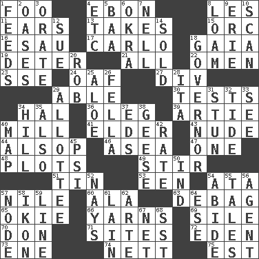 ACROSS 1. Egg _ yung 4. Inky black, to poets 8. French article 11. Hearing organs 13. Receives possession of 15. The grampus (Milton) 16. Son of Isaac 17. Monte _, Las Vegas Hotel/Casino 18. Greek goddess of the earth (variant) 19. Prevent from occurring 21. Everything 22. Sign of things to come 23. Compass dir. 24. Clumsy lout 27. HTML Container Element 29. Competent 30. Trials 34. Actor Linden 36. Cassini of fashion 39. Nick name for Arthur 40. Place where flour is made 41. A person who is older than you are 43. Unadorned 44. Columnist Joseph or Stewart 46. Toward the sea 47. Single 48. Secret plans 49. Commotion 51. Shallow baking pan 53. Car or cant ending 54. "One Day ___ Time" 57. "Death on the ____" 60. Wing 63. Debunk (Brit. slang) 65. Migrant worker of the '30s 66. Entertaining tales 69. Drop; flow; fall 70. Spanish title 71. Locates 72. Paradise 73. Compass dir. 74. Remaining after all deductions 75. Eastern Standard Time (abbr.) DOWN 1. Gives food to 2. Fertile tracts in a desert 3. Declaim 4. And so on (abbr.) 5. Sound made by sheep 6. Gumbo ingredient 7. 1994 drama film starring Jodie Foster 8. Rich soil 9. 4th largest of the Great Lakes 10. Examine hastily 12. Take to court 14. Disposed of to a purchaser 18. Head of state? 20. Director Reiner 25. Medicinal plant 26. Chap (slang) 28. Call ___ day 29. One to whom something is allotted 31. Surprise greatly 32. Periodic rise and fall of the sea level 33. Observe 34. Land elevation 35. In addition 37. Begley and Asner 38. Honkers 40. Atlas unit 42. Assign a rank or rating to 45. Air pressure measure (abbr.) 50. Indiana (abbr.) 52. Negative votes 54. Remain 55. Falsehoods 56. Representative 57. Thickened enlargement 58. Image 59. Actor's bit 61. (Had) reclined 62. Johnson of "Laugh-In" 64. Compass dir. 67. Fish or hair follower 68. Fast jet (abbr.)