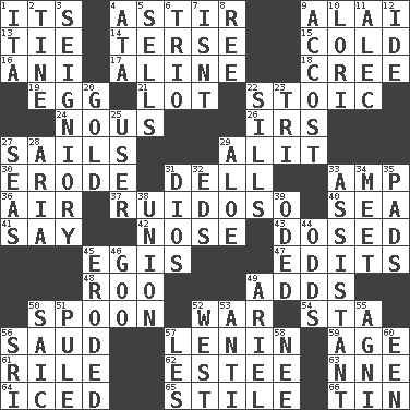ACROSS 1. ___ a Wonderful Life 4. Being in motion 9. Jai _ 13. Neckwear 14. Laconic 15. Having a low temperature 16. Black tropical American cuckoo 17. Place in a line 18. Algonquian 19. Oval reproductive body of a fowl 21. Car dealer's back yard 22. Unemotional 24. Common sense 26. Big collection agency 27. Travel by water 29. Set down 30. Wear away 31. Small valley 33. Electrical Unit 36. Wind 37. Noisy, rowdy, vocal (Spanish) 40. Ocean 41. Declare 42. Olfactory organ 43. Administered medicine 45. Armor plate that protects the chest 47. Proofreads 48. Friend of Pooh 49. Sums up 50. Soup utensil 52. Armed conflict 54. R.R. building 56. Saudi Arabian king (1953-1964) 57. Soviet premier 1918-24 59. Grow older 61. Cause heat under the collar 62. First name in cosmetics 63. Compass dir. 64. On the rocks 65. Vertical member of a panel or frame 66. Shallow baking pan DOWN 1. Call ___ day 2. Prong on a fork 3. Signiory (variant) 4. _ moment's notice (2 wds.) 5. Exchanges for money 6. Musical group of three 7. Is not 8. To sift 9. Buttonhole 10. Australian parrot (variant) 11. Actor Baldwin 12. Binary compound 20. Aureate 22. Beverly of Met fame 23. Three (prefix) 25. One who uses or employs something 27. Oceans 28. Operatic vocal solo 29. Medicinal plant 31. "Vaya con ____" 32. Begley and Asner 33. Helper 34. Confront 35. Groovy apts. 38. The state of being joined or united 39. Wrote a lyric poem 44. Likelihood 45. Eaten away 46. Thick or sticky substance 49. Satellite of Uranus 50. Ketch in the Levant 51. Whine 52. 270 degrees 53. Opposed to 55. Hindu god of fire 56. Indian title of respect (Mr.) 57. French article 58. Born 60. Car or cant ending