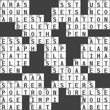 ACROSS 1. Ancient river in northeast Turkey 5. Fast jet (abbr.) 8. Purpose 11. Part of speech 12. Arranges properly for use 13. Non-commissioned officer (abbr.) 14. Most capable 17. Ski resort town in Vermont 19. Erase 21. Foolish or stupid persons 22. Writer of Portnoy's Complaint (1969) 23. Animal enclosure 24. Double-curved letter 27. Observes 29. Had dinner 32. Staphylococcus 34. Plant excrement 36. ____ Jay Lerner 37. Jacques of French films 38. Pipe bend 39. Pale green bean 40. Writer Wiesel 41. R.R. building 42. French painter Edouard 43. Elected rep. 44. Portico 46. Compass dir. 47. American Automobile Association (abbr.) 50. Singer James 52. A viewer who gazes fixedly 55. Michaelmas daisies 57. Characterized by complete cowardliness 59. Threatening words 62. Ripen 63. Body of Kaffir warriors 64. Horse sense 65. Actress Charlotte 66. Ingest 67. Collude with DOWN 1. Santa ___, CA 2. Director Reiner 3. Old (Scot.) 4. Contemptuous expression 5. Arrange properly for use 6. Empty completely 7. Sadhe (variant) 8. To (old English) 9. Highlander 10. Immeasurably long periods of time 12. Compass dir. 15. Make a splashing sound 16. False hair 18. Metal container 20. College papers 24. _____ Park, CO 25. Having lost freshness 26. Smooth fabric 28. Table seasonings 29. Place in a line 30. Domesticates 31. Maternal 33. Sliced dessert 35. Food holders 36. Chicken ___ king 42. Mother 45. "Beetle Bailey" pooch 47. Tate display 48. Nest on high 49. Scent 51. Sports stadium 52. Coast Guard woman 53. Ancient Roman robe 54. Toward shelter 55. Cuckoo 56. Oscar Madison type 58. Elect 60. Institute legal proceedings 61. Eastern Standard Time (abbr.)