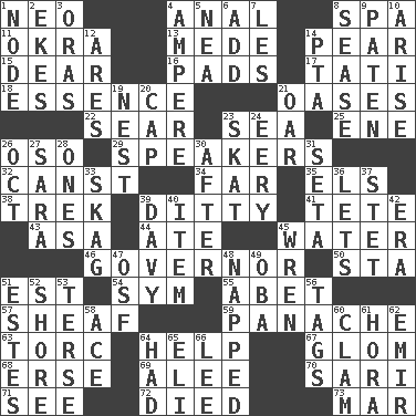 ACROSS 1. Modern: prefix 4. Of or related to the anus 8. Health resort 11. Gumbo ingredient 13. Ancient Persian 14. Lightbulb-shaped fruit 15. Letter starter 16. Groovy apts. 17. Jacques of French films 18. Center 21. Fertile tracts in a desert 22. Dry up 23. Ocean 25. Compass dir. 26. Bear (Spanish) 29. Orators 32. 2nd pers. sing. pres. of can (arch.) 34. Distant 35. Raised railways 38. Long journey 39. Simple song 41. False hair 43. White ___ sheet 44. Had dinner 45. Wetness 46. Head of state? 50. R.R. building 51. Eastern Standard Time (abbr.) 54. Symbol (abbr.) 55. Collude with 57. To gather and bind into a bundle 59. Flamboyance 63. Torque (variant) 64. Aid 67. Take by theft 68. Celtic language 69. Toward shelter 70. Indian skirt 71. Observe 72. Passed on 73. Spoil DOWN 1. Connecting point 2. Supplements with great effort 3. Mouths or openings 4. Electrical Unit 5. Teachers' org. 6. Say or write further 7. French article 8. Gospel singer Marvin 9. Eucharist need 10. Ascend 12. Ancient Greek god of war 14. Parent Teacher Assoc. 19. Egg locale 20. Head covering 21. Rowing implement 23. Three-handed card game 24. Suggestive of the supernatural 26. Sep. follower 27. "Two Mules for Sister ____" 28. Washington bills 30. Following 31. Bristle 33. Heroin 36. Allows 37. Proofreading order 39. American folk hero Crockett 40. Detail 42. Epoch 45. Songbird 47. Order of Saint Francis (abbr.) 48. Slept 49. Chief or king in Benin or Nigeria 51. _____ Park, CO 52. Dinah or Pauly 53. Laconic 56. Labels 58. Adept person 60. Burrowing marine mollusk 61. Israeli folk dance 62. Arab leader 64. Possessed 65. Biblical high priest 66. Area sheltered from the wind