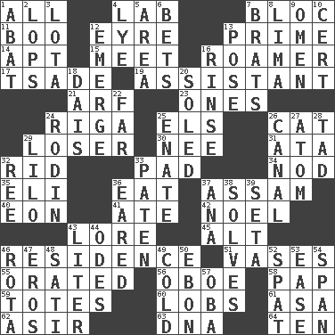 ACROSS 1. Everything 4. Experiment locale 7. Coalition 11. Surprise greeting 12. Jane of fiction 13. A-one 14. Fitting 15. Rendezvous 16. Nomad 17. Sadhe (variant) 19. Helper 21. Sandy's bark 23. Washington bills 24. Capital of Latvia 25. Raised railways 26. Domesticated feline 29. Failure 30. Born 31. "One Day ___ Time" 32. To free from 33. Groovy apt. 34. Dreamland 35. Biblical high priest 36. Erode 37. Indian state 40. Period of immesurable duration 41. Had dinner 42. Christmas carol 43. Old wives' tales, e.g. 45. Keyboard modifier key 46. Home 51. Flower holders 55. Declaimed 56. Mitch Miller's instrument 58. Infant food 59. Hauls 60. Tennis shots 61. White ___ sheet 62. SW Saudi Arabia district 63. Heredity factor (abbr.) 64. "___ Little Indians" DOWN 1. Blind as ____ 2. Chops off 3. Globular water bottle used in Asia 4. Sodium hydroxide 5. Length times width 6. Stakes 7. Naughty children 8. Pale green bean 9. Sign of something about to happen 10. An absolute certainty 12. Develop 13. Introduce or present, as a question 16. Remove soap 18. Raised platform 20. Having a sole or soles 22. At a great distance 24. "The Thinker" sculptor 25. Related on the mother's side 26. Lessep's creation 27. Smallest unit of an element 28. Small boy 29. _ and Stitch 32. Portuguese money of account (variant) 33. Eucharist need 36. Having ears or earlike features 37. Santa ___, CA 38. Finds the solution 39. Stalk of a moss capsule 43. 61 cubic inches 44. Lyric poems 46. Round or rotation of duties 47. Greek god of love 48. Suttee (variant) 49. Chilled 50. Inky black, to poets 52. Argument over a trivial matter 53. Relaxation 54. Connect, as a bridge 57. Chief or king in Benin or Nigeria